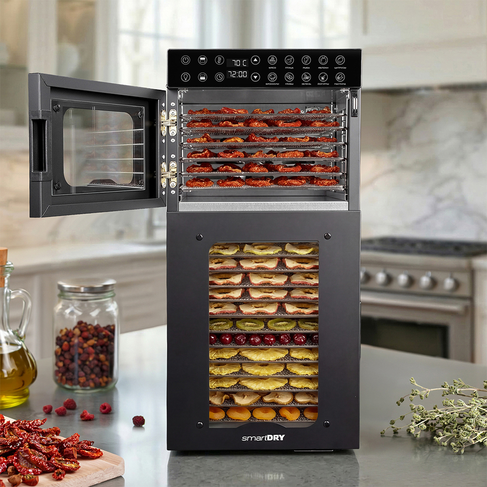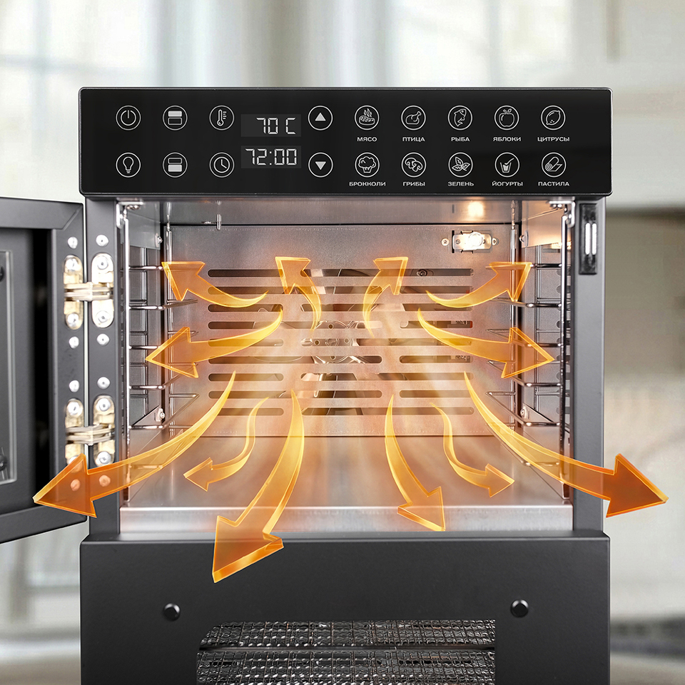 Такая циркуляция особенно важна при одновременной сушке разных ингредиентов: например, травы и фруктов. Они не смешивают ароматы и не теряют свой цвет.