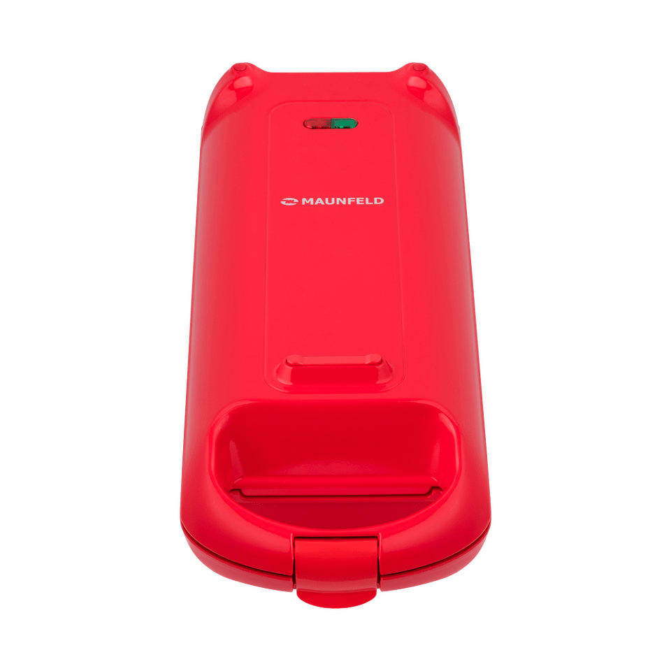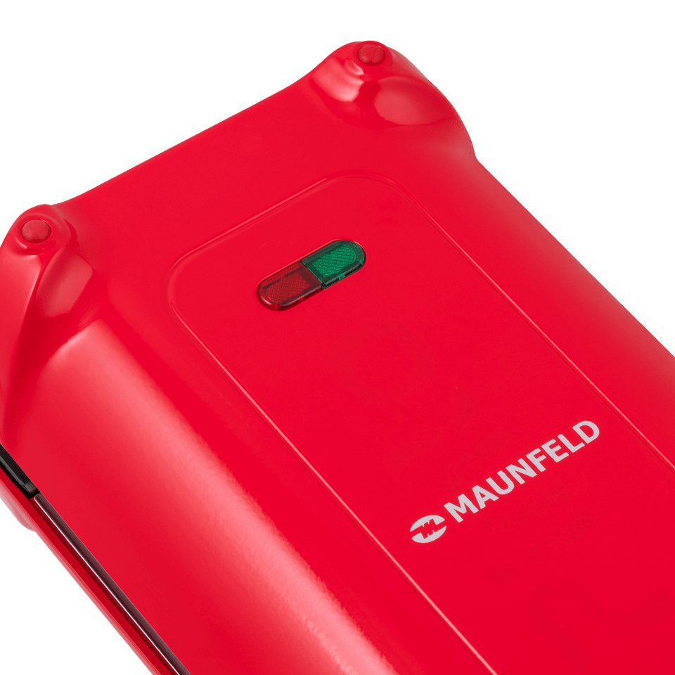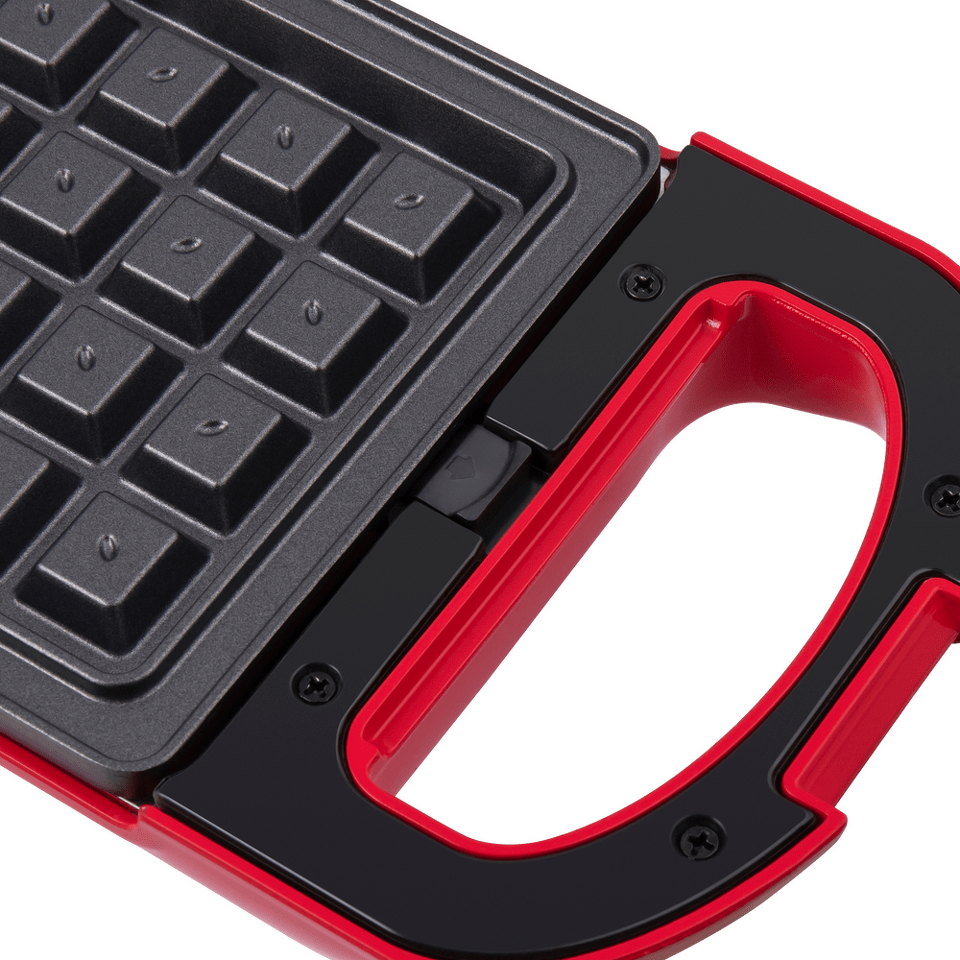 Дизайнерская прямоугольная вафельница мощностью 700 Вт, сделанная из термостойкой пластмассы яркого алого цвета, позволит за 5 минут приготовить две аппетитнейшие венские вафли размером 10х10.