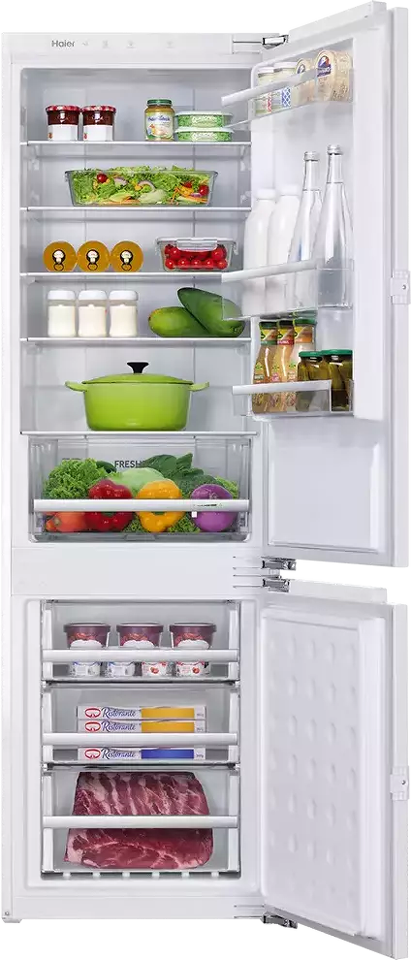 Встраиваемый HAIER BCFT528AWRU — отличный пример действительно современного и удобного холодильника высотой 177 см. Холодильник позволяет хранить одновременно много продуктов (холодильное отделение — 169 л, морозильное — 59 л), что важно для больших семей и для тех, кто любит готовить. Технология Total No Frost позволяет забыть о ручном размораживании — в обоих отделениях реализовано авторазмораживание. Надёжный компрессор обеспечивает бесперебойную работу холодильника при низком энергопотреблении — класс энергоэффективности А. Полки и контейнеры со стильной серебристой окантовкой придают внутреннему пространству модный и современный вид. Светодиодное (LED) освещение — яркое, долговечное и не влияет на температуру в холодильном отделении, в отличие от ламп накаливания. Интуитивно понятное сенсорное управление с дисплеем делает эксплуатацию холодильника максимально удобной. Встраиваемый холодильник HAIER BCFT528AWRU — это дополнительные возможности для экспериментов с дизайном кухни и качественное хранение продуктов.