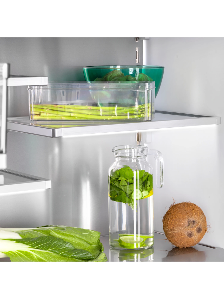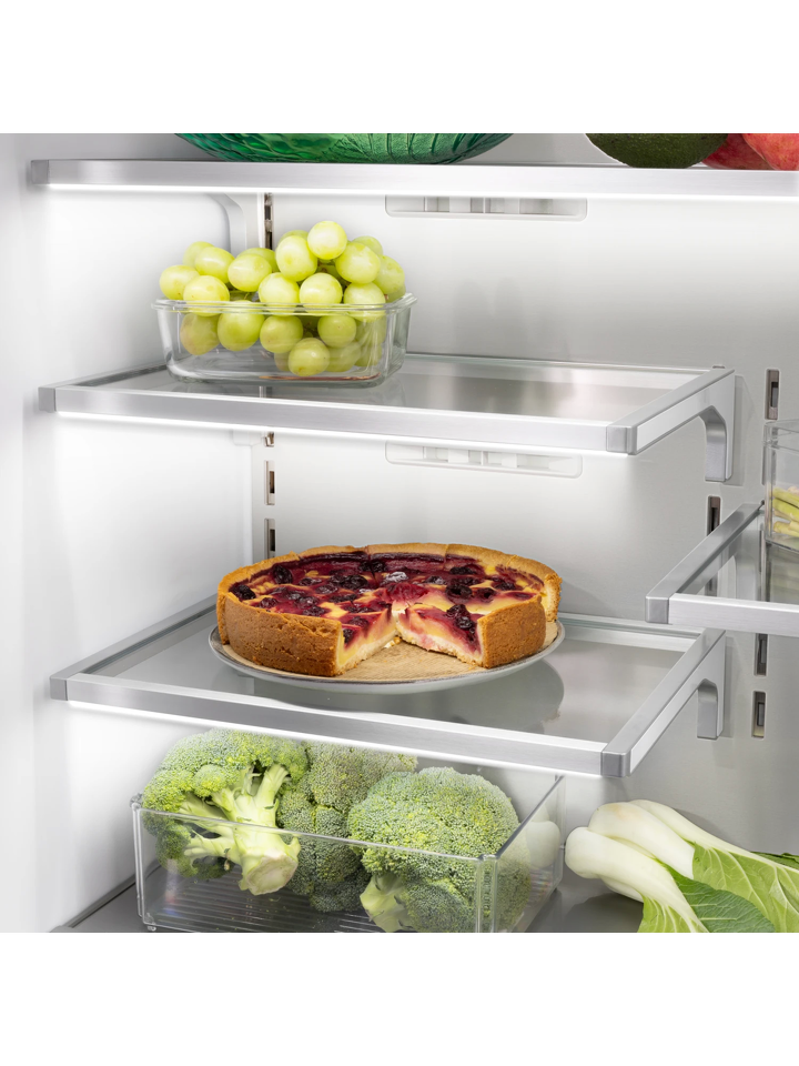 Продуманная внутренняя эргономика холодильника делает хранение продуктов максимально удобным. Все ящики модели оснащены направляющими и доводчиками, открываются легким нажатием, в дверях холодильной и морозильной камер также предусмотрены доводчики. Полки холодильного и морозильного отделений имеют LED-подсветку, что обеспечивает отличный обзор продуктов.