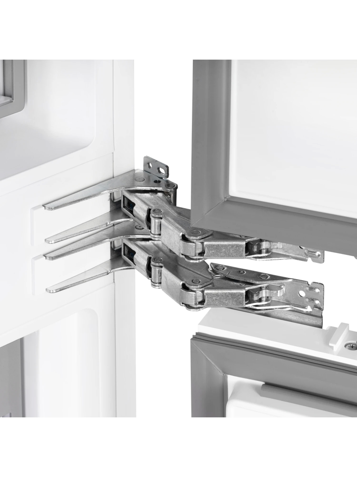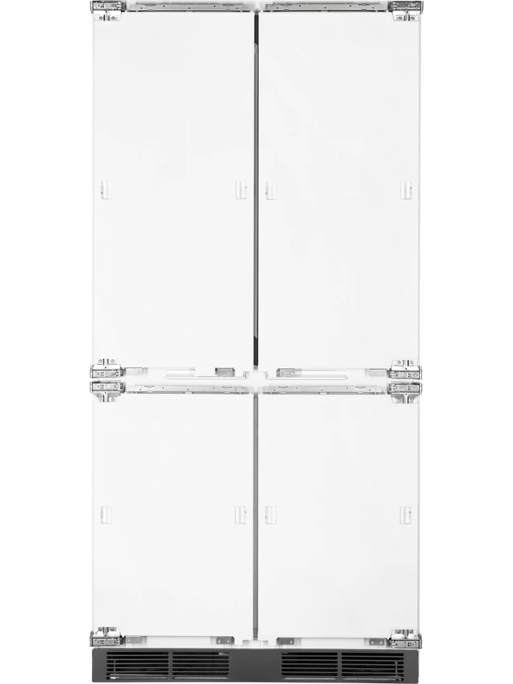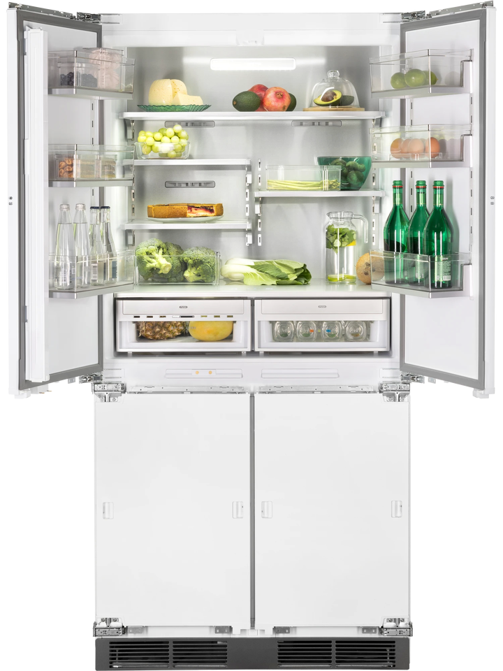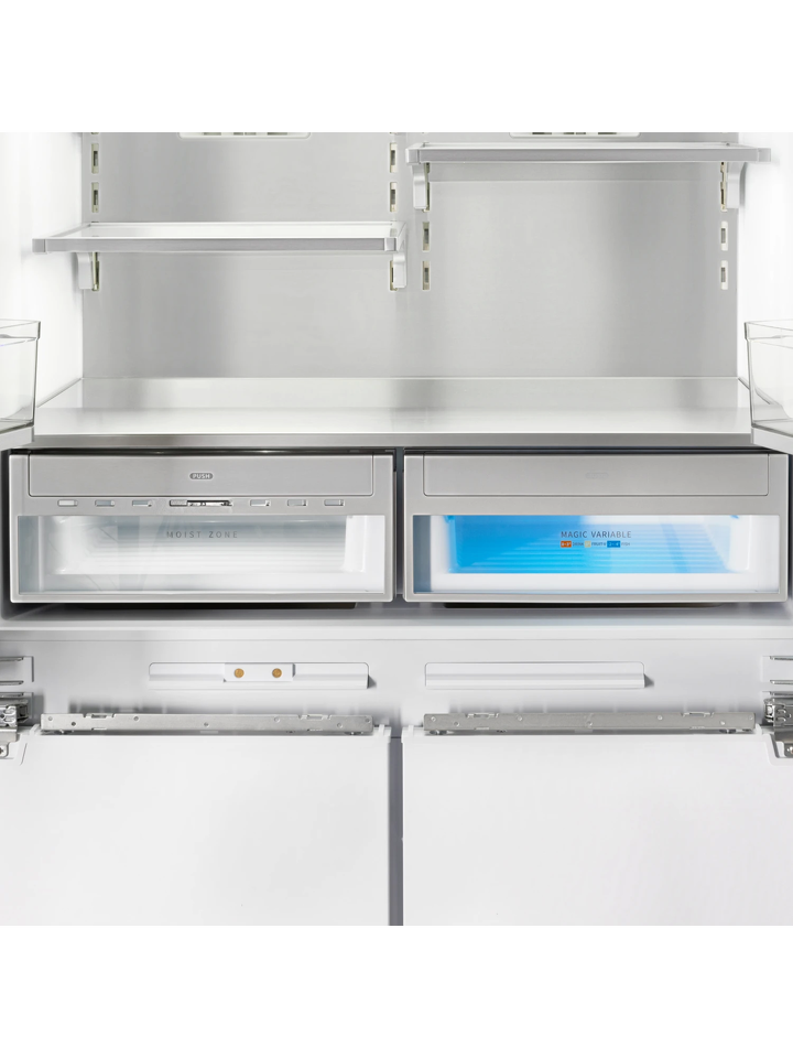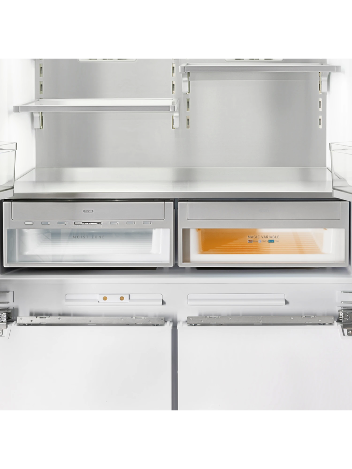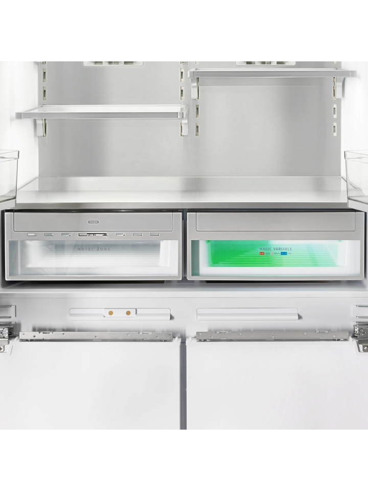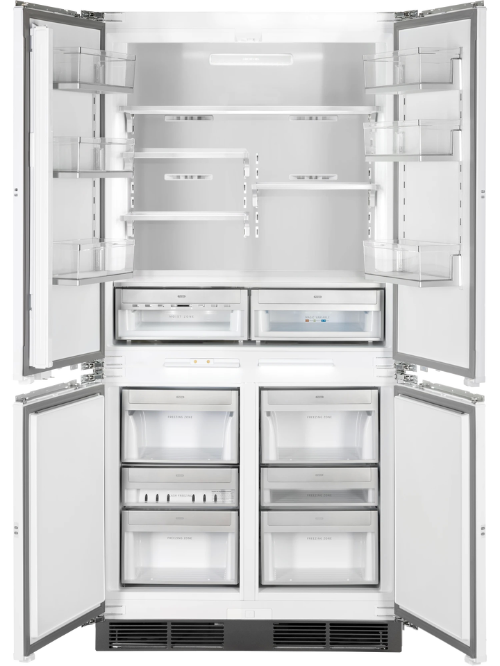 Благодаря четырехдверной конструкции и открыванию дверь в дверь пользователь получает доступ к продуктам, не выпуская при этом холод из остальной части холодильника. Модель имеет жесткую систему крепления фасадов: они не связаны с корпусом шкафа, не предполагают наличие дополнительных петель. Холодильник имеет неограниченный угол открывания, отсутствуют зазоры, в которых могут скапливаться загрязнения.