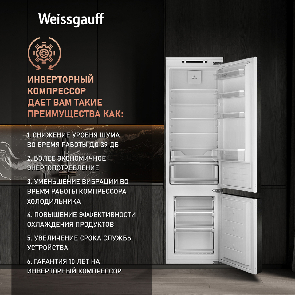 Инверторный двигатель - с гарантией 10 лет от производителя это совершенно новая ступень эффективности в сравнении с традиционными линейными моделями! Уменьшенное энергопотребление, минимизация уровня шума, а также увеличение срока службы вашего холодильника - вот лишь некоторые из преимуществ, которые дает инверторная технология в этом замечательном устройстве от Weissgauff!