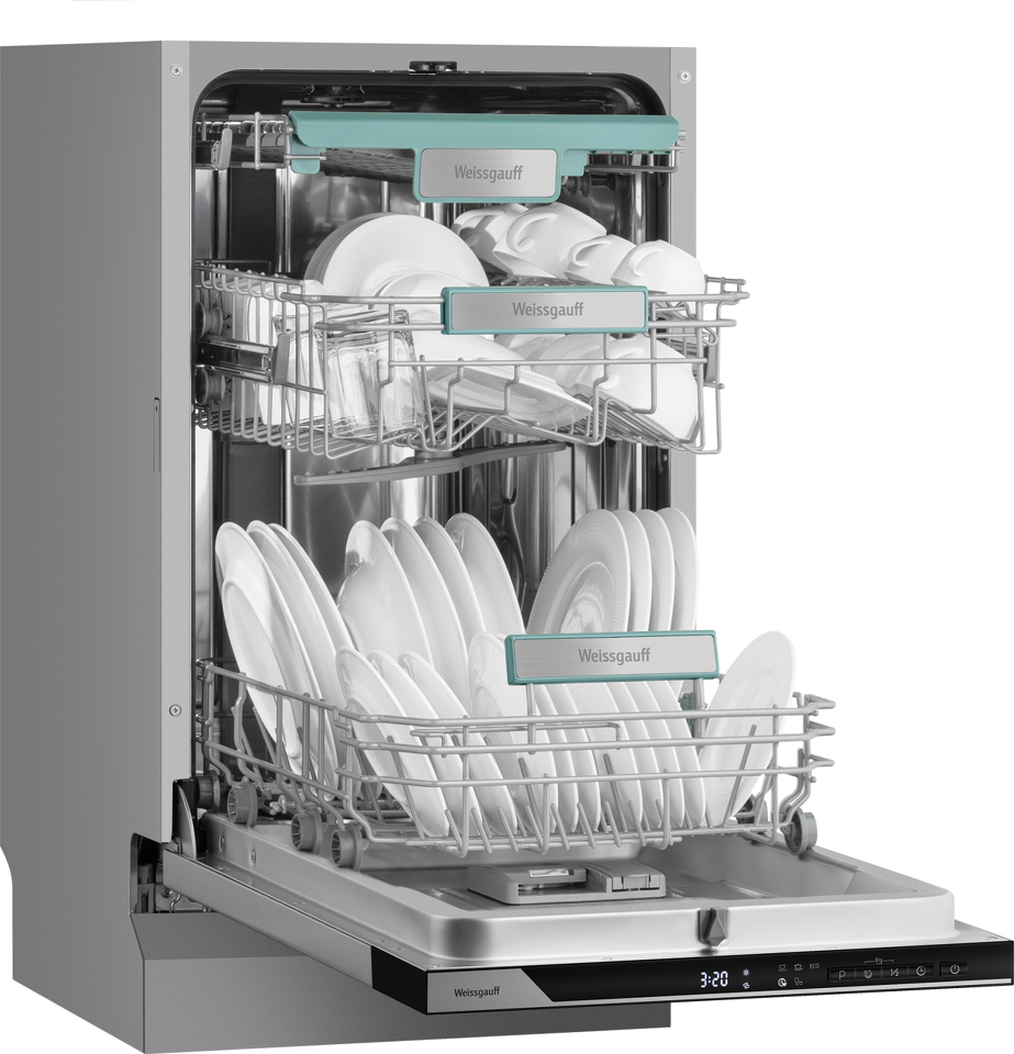 До 10 комплектов посуды одновременно вы можете расположить в данной посудомоечной машине, благодаря современным продуманным и эргономичным корзинам, которыми Weissgauff оснастили эту модель