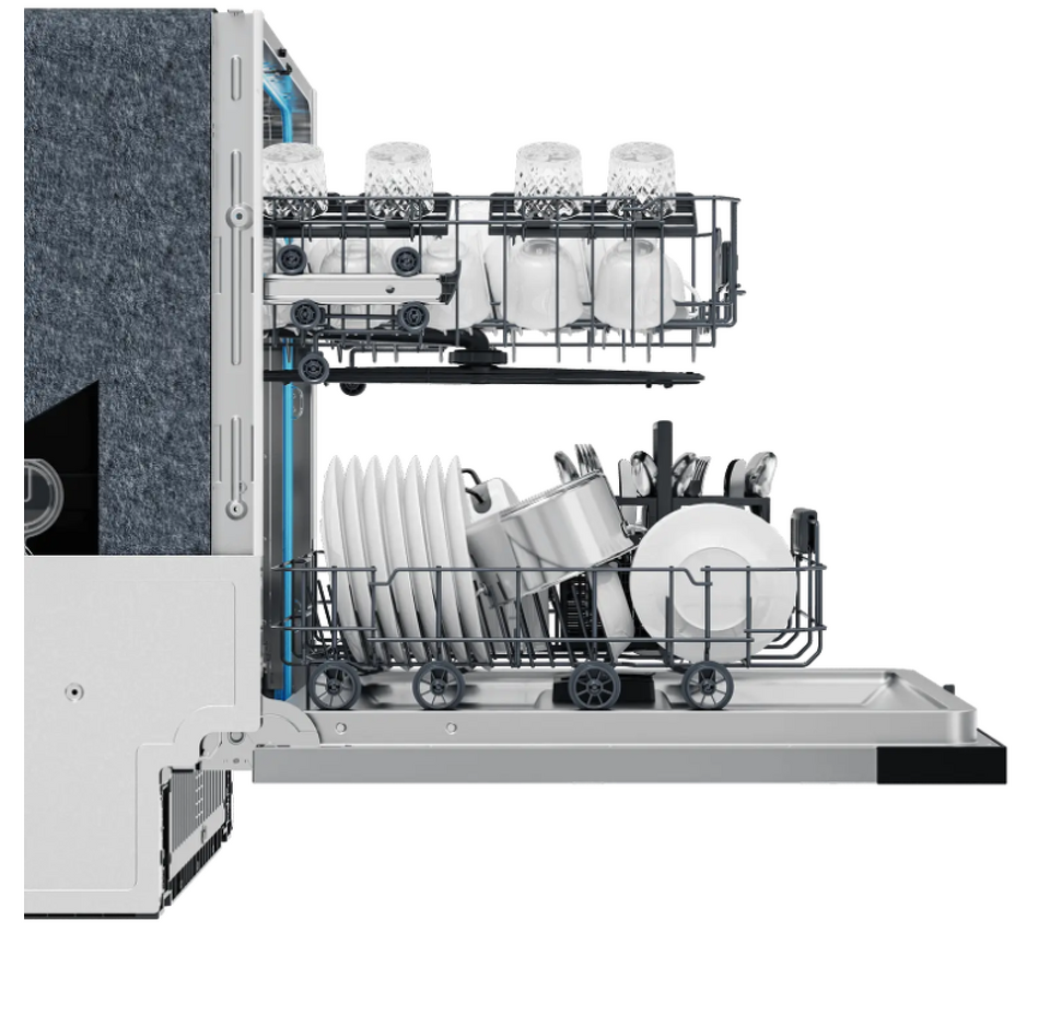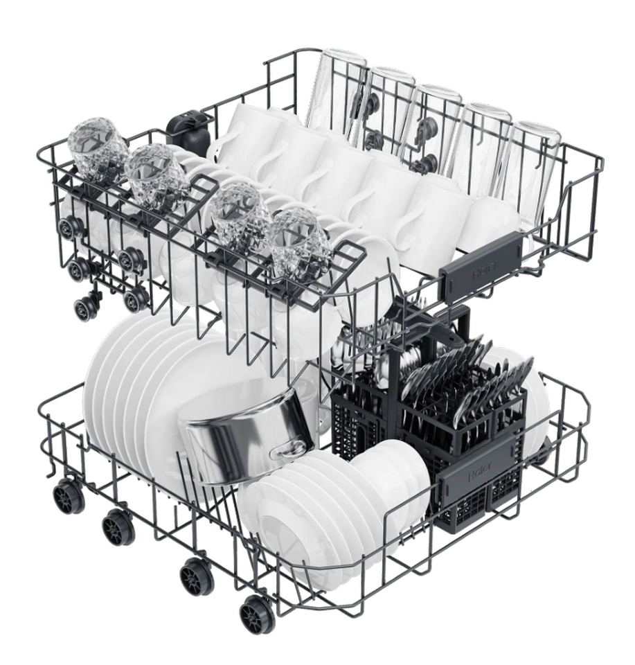 Встраиваемая посудомоечная машина шириной 60 см HDWE14-592RU рассчитана на загрузку до 14 стандартных комплектов посуды, такая большая вместимость поможет помыть за один цикл всю посуду практически в любой жизненной ситуации, причем в нижней и средней корзине есть складные держатели для тарелок. В нижней корзине есть складные держатели для тарелок, а верхнюю корзину можно отрегулировать по высоте, чтобы максимально удобно загрузить всю посуду. Важная особенность этой модели — автоматическое открывание двери в конце программы мойки. Так посуда высохнет более быстро и качественно без дополнительного расхода электроэнергии.