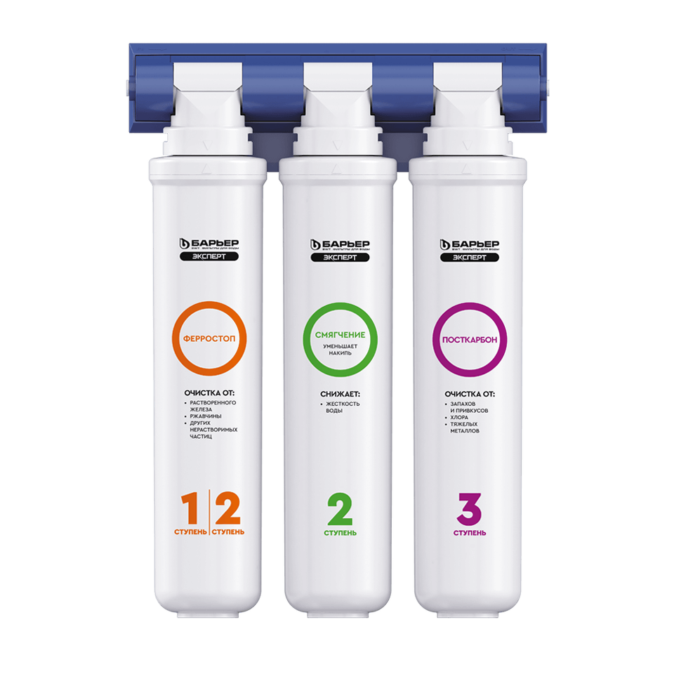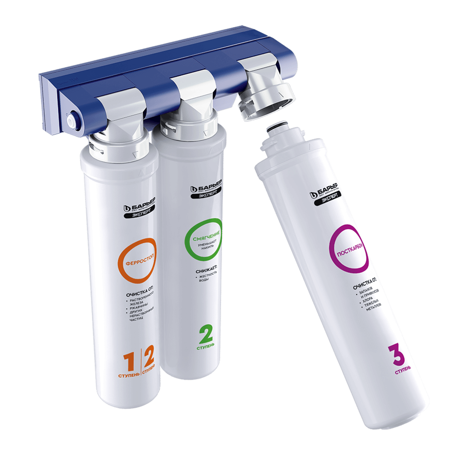 3."БАРЬЕР ЭКСПЕРТ ПостКарбон" - финишная очистка и кондиционирование, устранение неприятных привкусов и остаточного хлора.