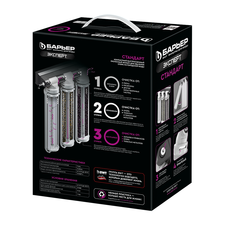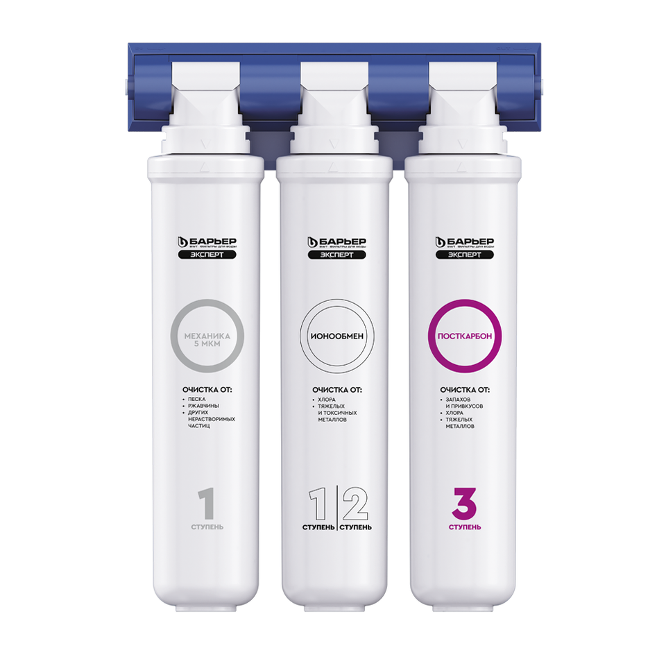 3."БАРЬЕР ЭКСПЕРТ ПостКарбон" - финишная очистка и кондиционирование, устранение неприятных привкусов и остаточного хлора.