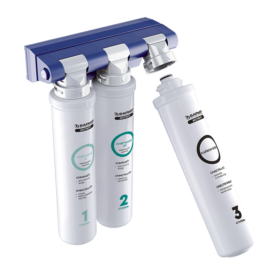 1. "БАРЬЕР ЭКСПЕРТ Смягчение х1" - сочетание сорбционной и механической очистки до 5 мкм, предварительное умягчение. Удаляет соли жесткости, тяжелые металлы, соединения хлора и механические частицы.