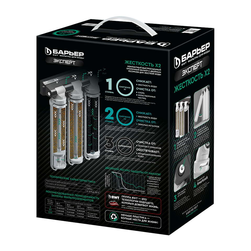 2. "БАРЬЕР ЭКСПЕРТ Смягчение х2" – сочетание сорбционной очистки и второй этап умягчения. Удаляет остаточные тяжелые металлы и накипь.