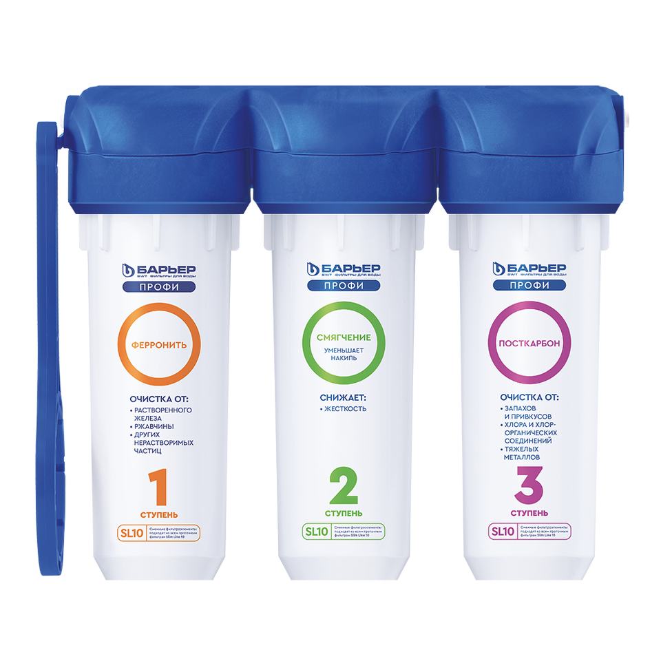 Классический 3-х ступенчатый фильтр с картриджами стандарта SlimLine 10’’ для доочистки железистой и жёсткой воды. Обеспечивает одновременное обезжелезивание и умягчение воды. Эффективно удаляет растворённое (двухвалентное) и коллоидное (трёхвалентное) железо.