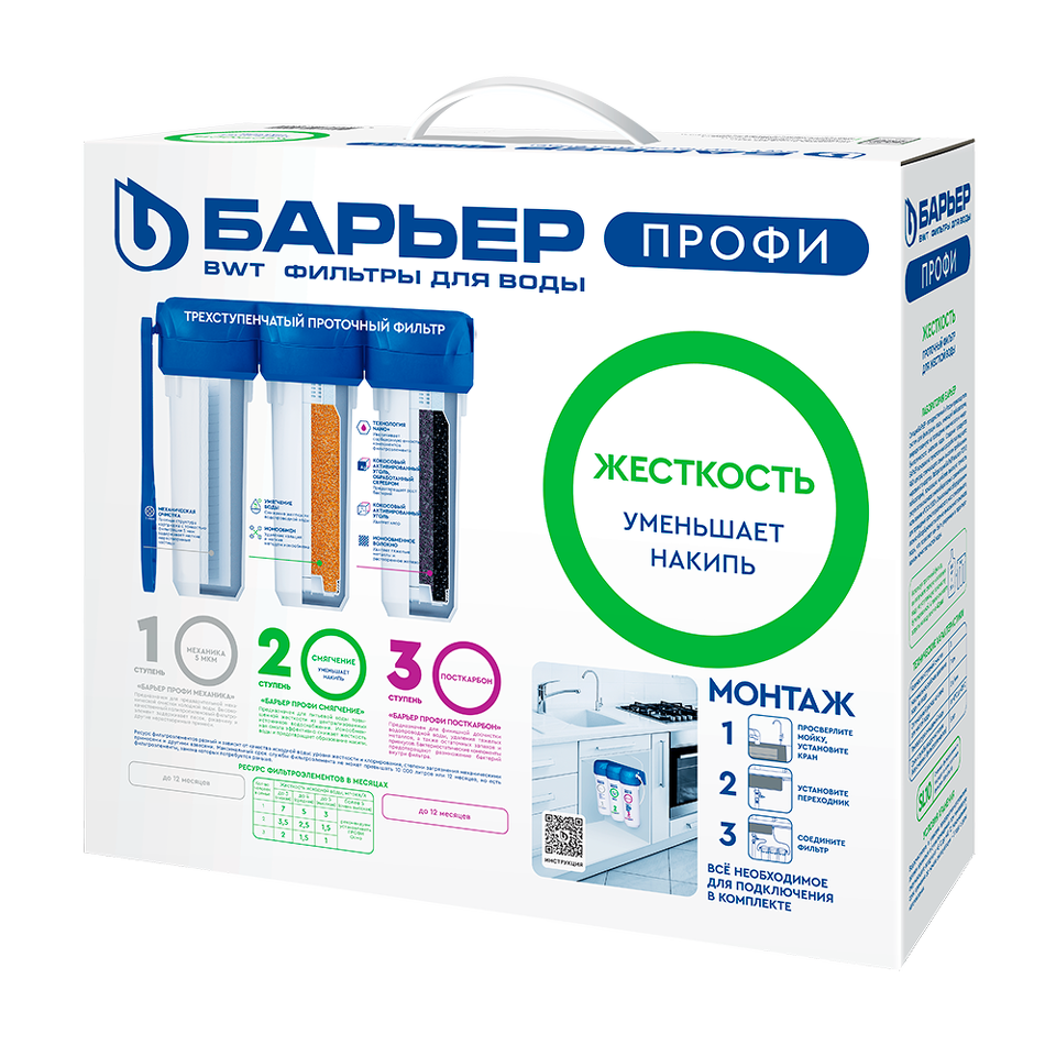2."БАРЬЕР ПРОФИ Смягчение" - снижение карбонатной жесткости, из-за которой образуется накипь в чайнике. Ресурс по умягчению воды до полугода. Но картридж может быть подвергнут регенерации в домашних условиях с помощью простой поваренной НЕ йодированной соли не чаще 8 раз.