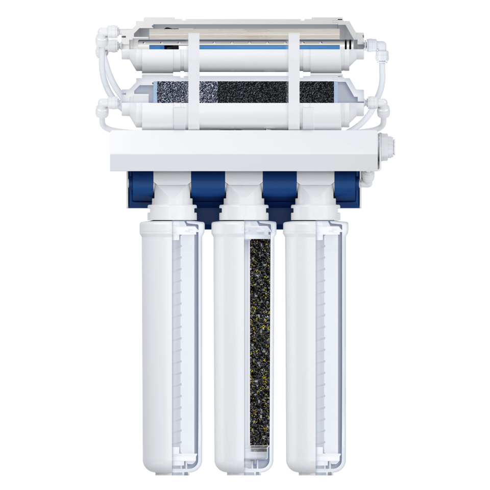 5-ступенчатый компактный фильтр обратного осмоса с возможностью замены картриджей без применения специальных инструментов. Обеспечивает глубокую комплексную очистку. Поры обратноосмотической мембраны сопоставимы с размерами молекул воды, поэтому они задерживают 99,9% примесей: соли жесткости, тяжелые металлы, бактерии, вирусы, опасные химические соединения.