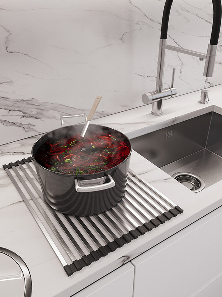 Стильные коврики «Ролл-мат» расстилаются на кухонных мойках или на столешнице. Используют для сушки овощей, посуды, а также для размещения горячих кастрюль и сковородок.
