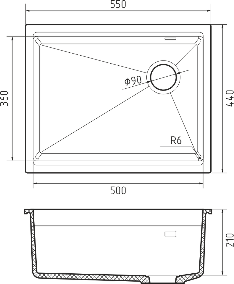 Фото Гранитная мойка Rivelato LINO 554-R 1-чаш 550*440 grigio metallizzato