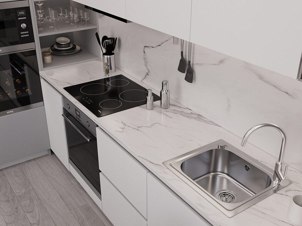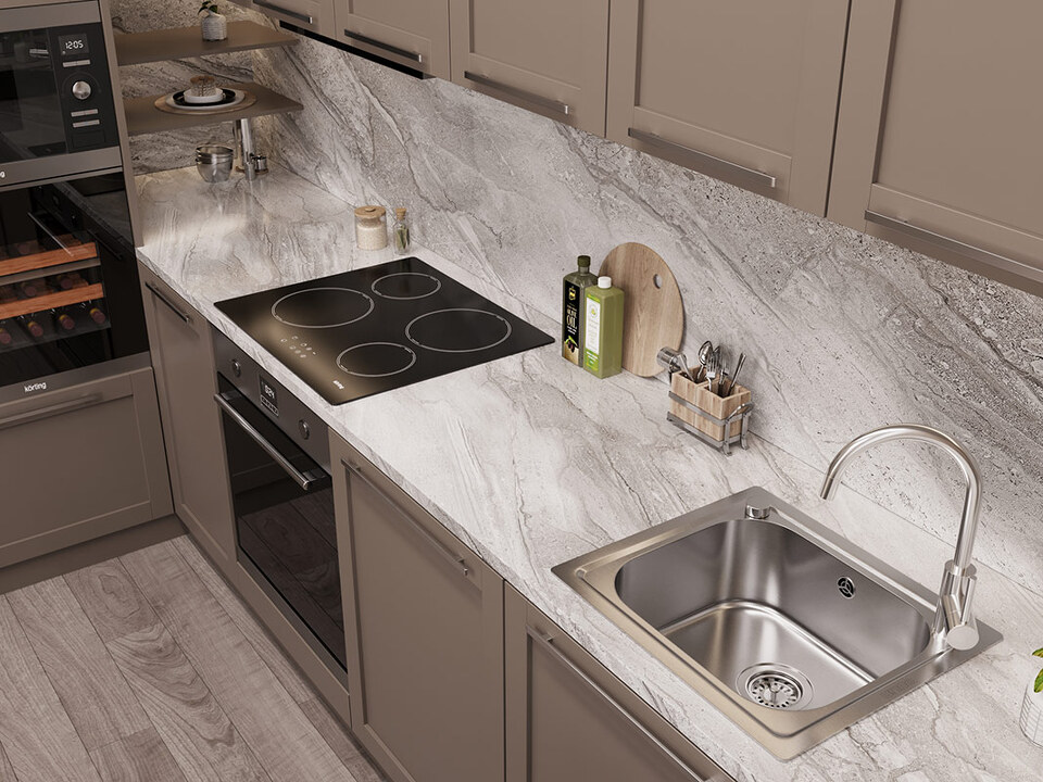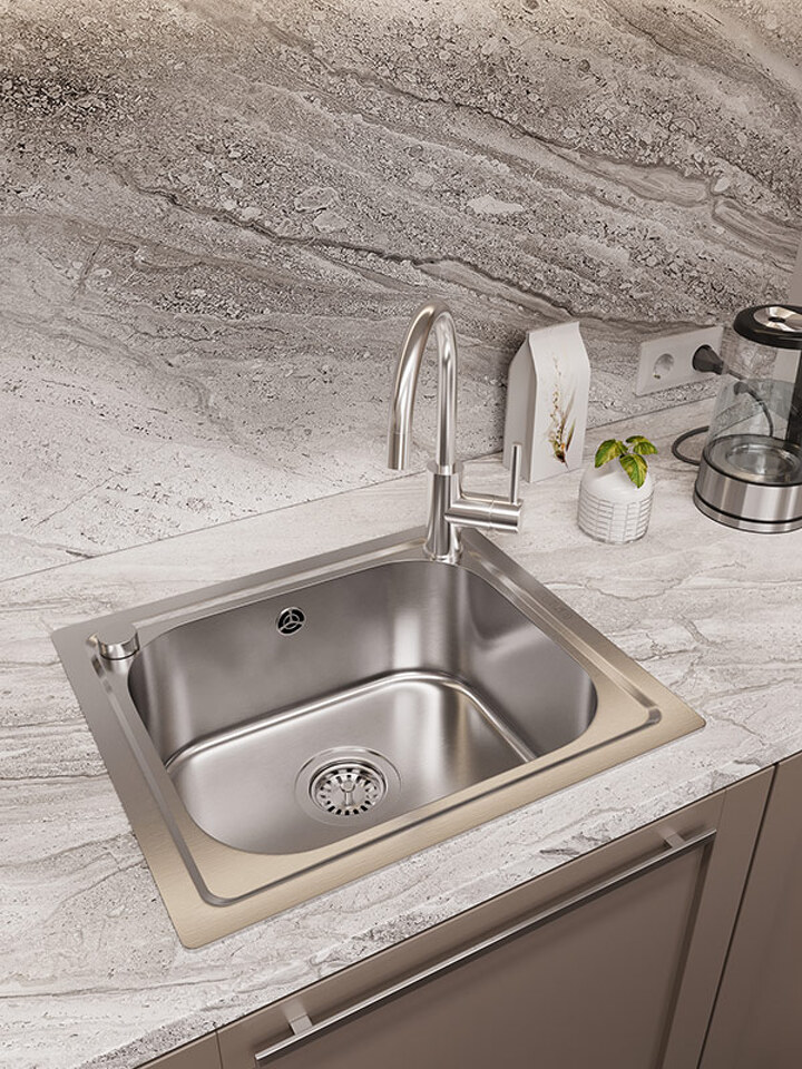 Мойка из нержавеющей стали AISI. AISI 304 содержит 18% хрома и 9% никеля, что обеспечивает максимальную устойчивость к коррозии. Шлифованная поверхность моек OULIN достигается по технологии Satin Finish Brushing. С обратной стороны, на дне чаши, находятся резиновые шумопоглащающие накладки и антиконденсатное покрытие, что делает мойку бесшумной.