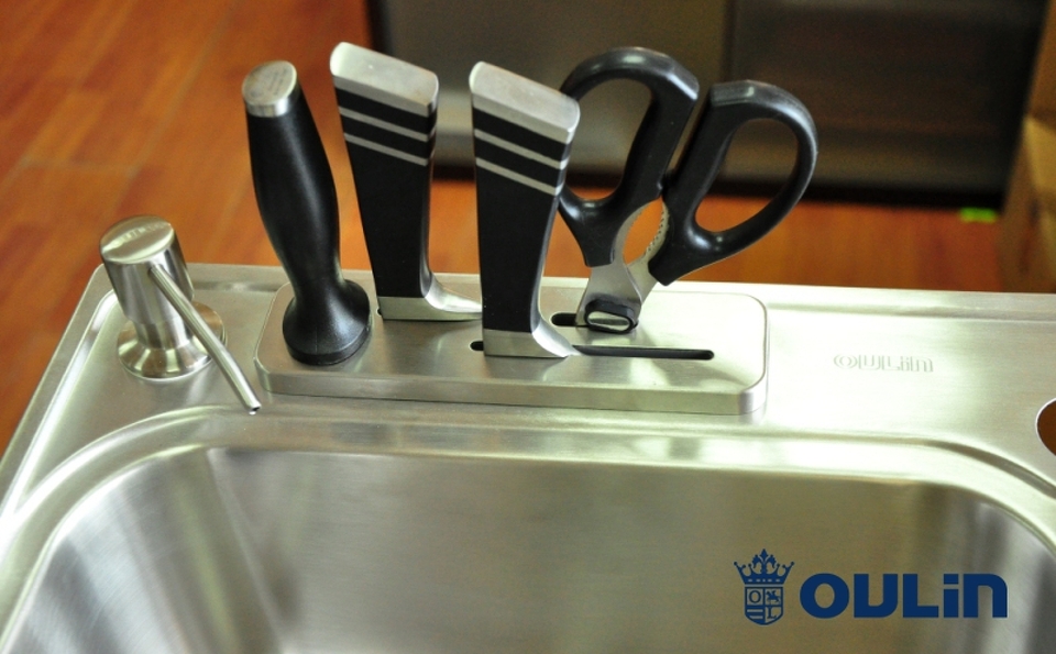 OULIN OL-H9910 практичная мойка для кухни с двумя большими чашами и удобным набором для кухни (ножи+ножницы), идущим в комплекте Мойки OULIN производятся из высококачественной нержавеющей стали марки 304 Необорачиваемая Поверхность мойки – полированная, матовая Шумопоглощающие накладки с обратной стороны мойки Шлифованная поверхность мойки достигается брашингу (шлифование щётками) Идеально подходит для классических и современных кухонь