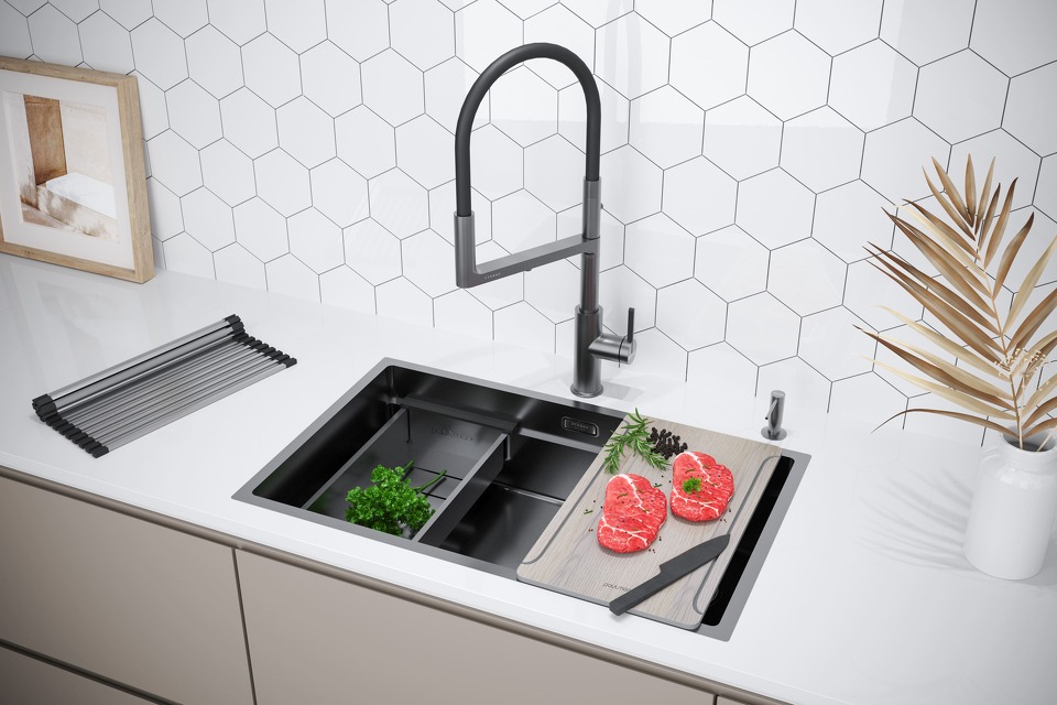 Трехуровневая мойка из нержавеющей стали NEXT-PRO 74 UNI разработана специально для использования вместе с аксессуарами, такими как ролл-мат, коландер, разделочная доска. Встроенный уступ в чаше мойки создает дополнительный уровень для установки аксессуаров. Таким образом, мойка становится единой точкой для подготовки продуктов перед их приготовлением. Мыть продукты, обсушивать их, нарезать и сразу перекладывать в кастрюлю или чашу пароварки можно находясь около мойки. Трехуровневая мойка NEXT-PRO 74 UNI помогает правильно организовать рабочее пространство.