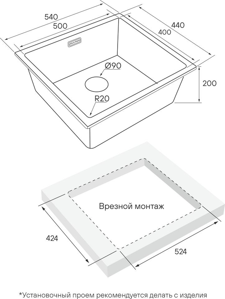Мойки VISTA UNI могут быть установлены как врезным способом поверх столешницы, так и под столешницу (подстольный монтаж).