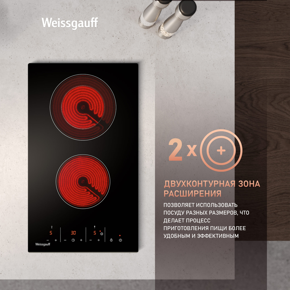 Варочная панель Weissgauff в дизайне "Домино", оснащенная двухконтурной зоной - это сочетание самых технологичных решений и эргономичного дизайна в одном устройстве