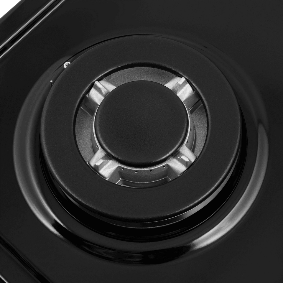Решетки расположены вплотную друг к другу и образуют единую рабочую зону, что позволяет, не поднимая посуду, передвигать ее с конфорки на конфорку. Поворотные цельнометаллические ручки регулируют силу пламени.