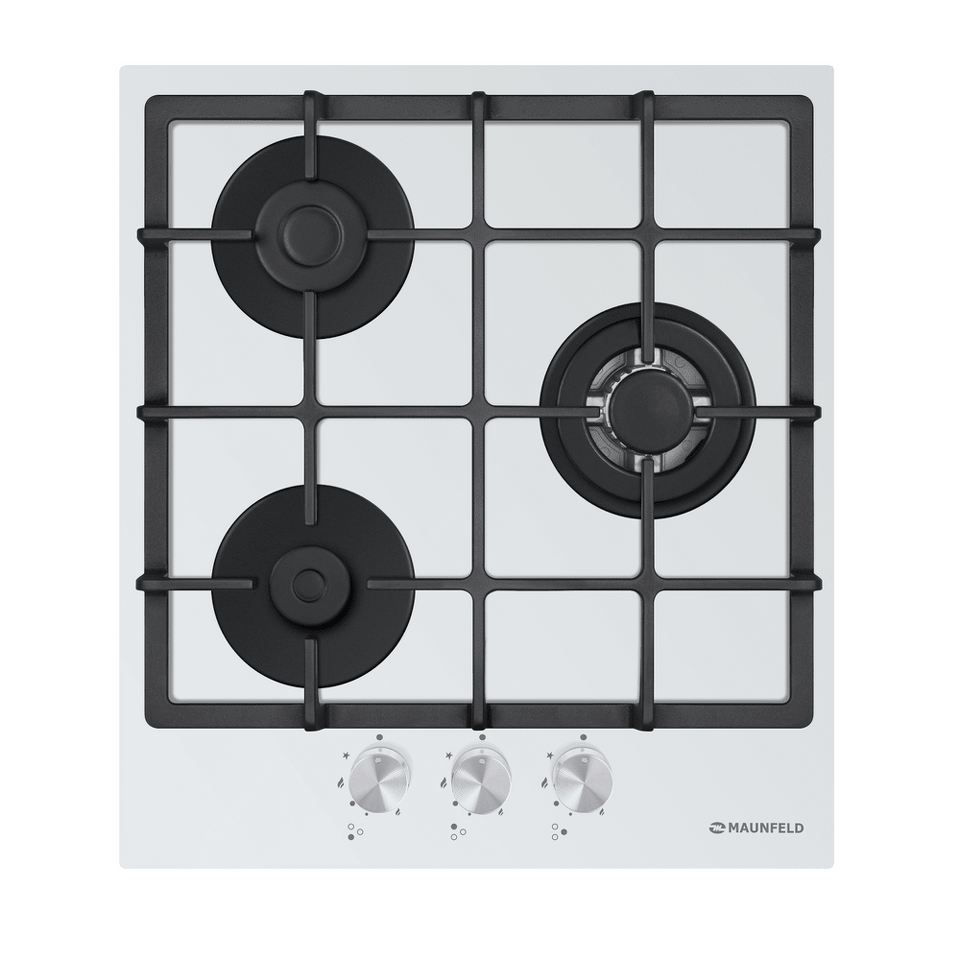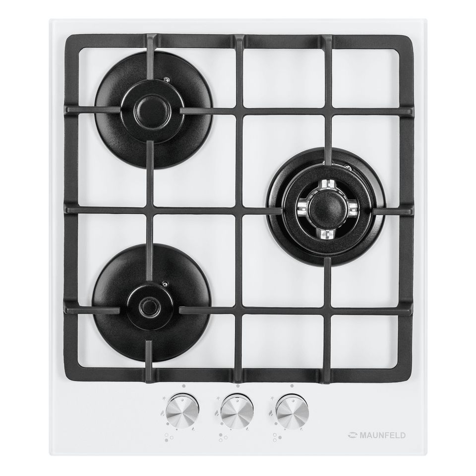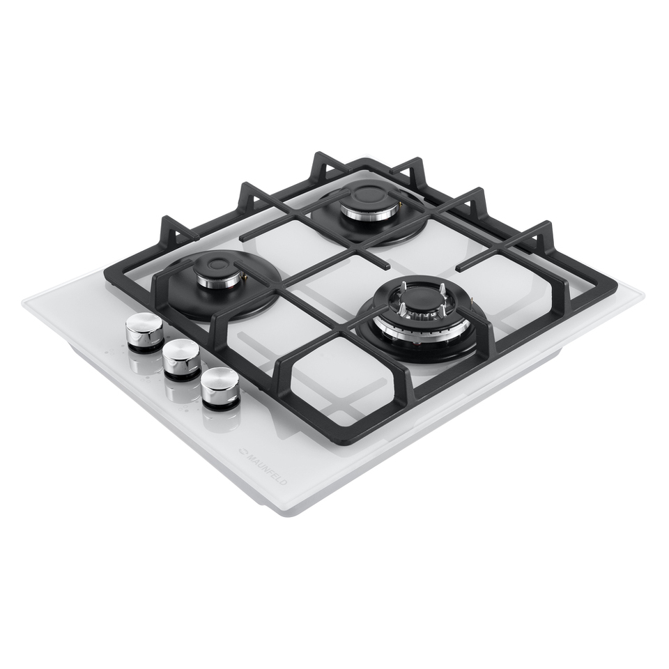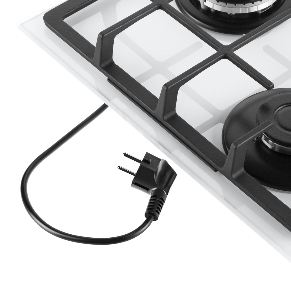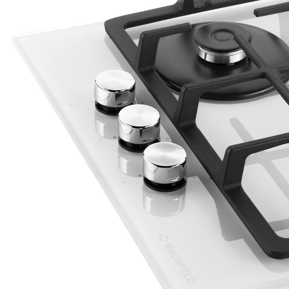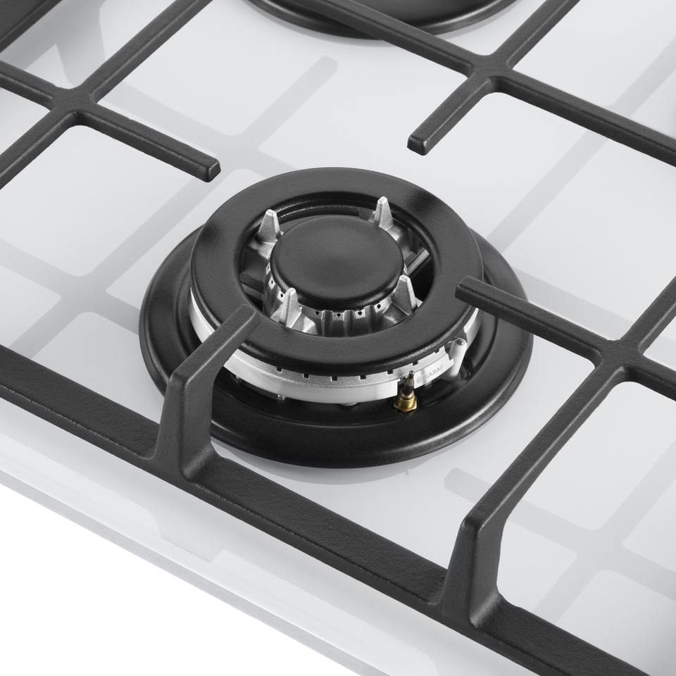 Панель выполнена из закаленного стекла белого цвета. В данной модели установлены итальянские горелки SABAF. Две стандартные конфорки мощностью 1000 Вт, 1700 Вт и одна мощная WOK-конфорка с двойным пламенем мощностью 3000 Вт. Они спроектированы таким образом, что огонь не перегревает ни чугунные решетки, ни ручки управления.