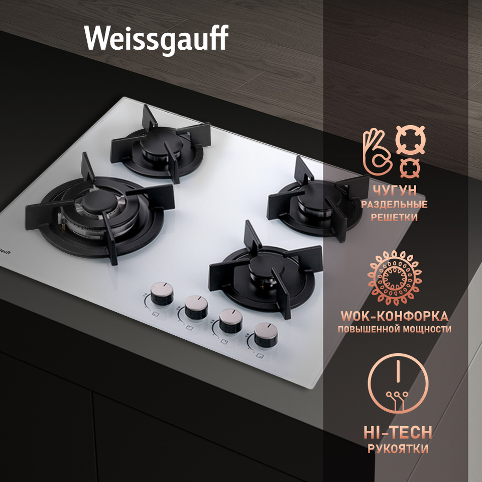 Встраиваемая независимая газовая панель Weissgauff шириной 60 см, исполненная в закалённом белом стекле - это стильное и компактное решение для вашей кухни!
