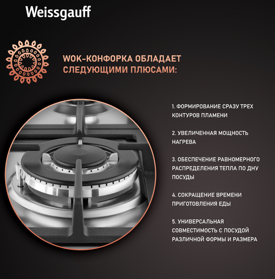 WOK-конфорка повышенной мощности, которая создаёт сразу три кольца пламени и позволяет осуществить нагрев даже самой крупной посуды в кратчайший срок!