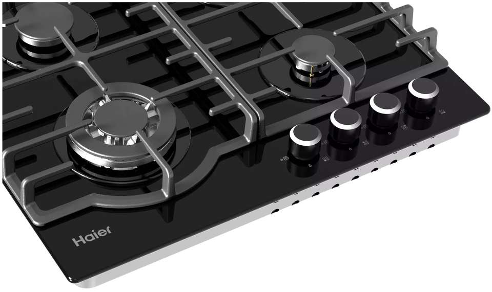 Газовая варочная панель Haier HHX-G64RFB на чёрном закалённом стекле смотрится лаконично и стильно. Кроме классических конфорок разного диаметра, панель оснащена двухконтурной конфоркой повышенной мощности 3,8 кВт — с ней легко и быстро приготовятся блюда даже в объёмных кастрюлях, больших сковородах. Двухконтурная конфорка, которую также называют ВОК-конфоркой, расположена в передней части панели, но с противоположной стороны от регуляторов. В каждую конфорку интегрирован электроподжиг — пламя легко зажигается без спичек. Если вдруг пламя случайно погаснет, сработает функция «газ-контроль» — подача газа будет автоматически перекрыта. Чугунные решётки обеспечивают устойчивость посуды во время готовки, они съёмные — это облегчает уход. Поворотные регуляторы управления конфорками, изготовленные из металла, вынесены в переднюю часть панели. Haier HHX-G64RFB — стильная, удобная, безопасная и практичная варочная панель для вашей кухни.