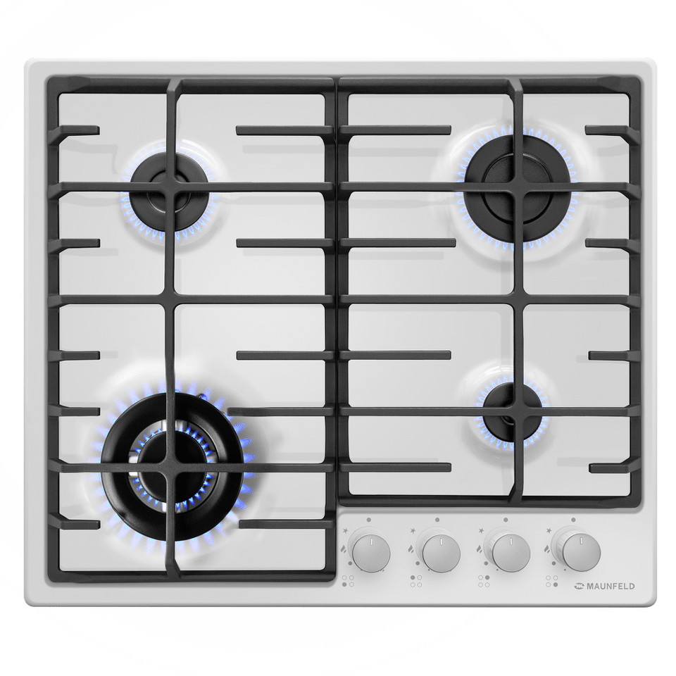 Панель оснащена 4 газовыми конфорками мощностью 3800, 1700, 2600, 1000 Вт. Благодаря специальной конструкции конфорок, они не перегревают чугунные решетки и ручки управления.