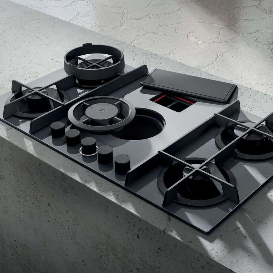 Дизайн: Первая в мире газовая панель ELICA NIKOLATESLA FLAME BL/A/88 со встроенной вытяжкой. Чугунные компоненты гармонично сочетаются с черной поверхностью.