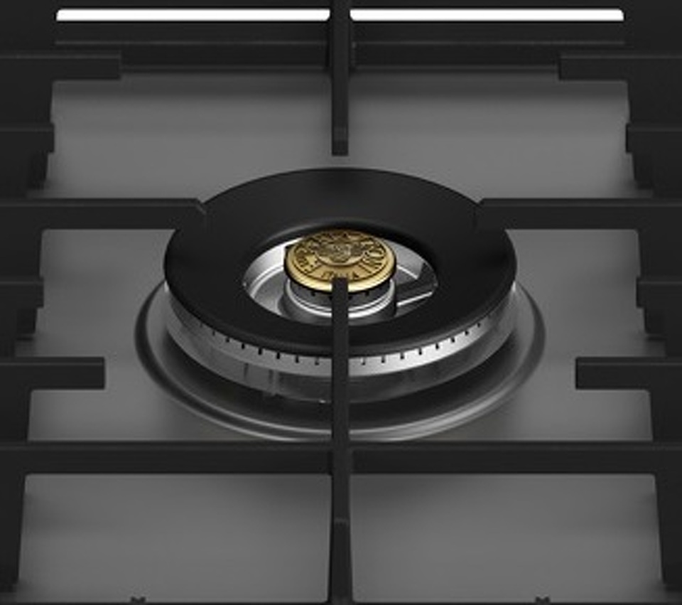 Bertazzoni P905CMODNE — газовая варочная панель с 5 конфорками. Центральная горелка Dual wok мощностью 5 кВт поможет приготовить экзотические блюда. Функция газ-контроля обеспечит безопасность эксплуатации. С помощью автоподжига можно включить устройство одним касанием. Управляется поворотными рукоятками с металлическим покрытием.