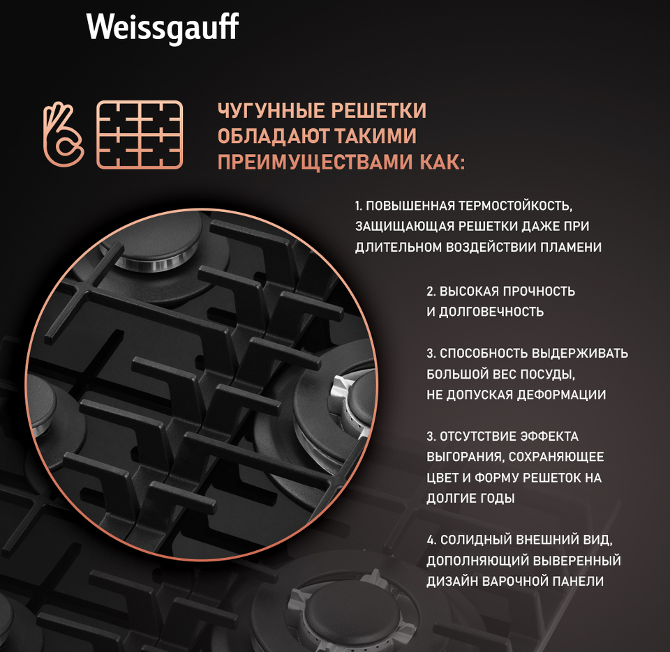 Решетки из высококачественного чугуна это неизменное качество, надежность и долговечность, воплощенные в каждой детали! Благодаря особому строению цельных решеток Weissgauff, размещение посуды на них становится ещё более удобным и устойчивым!