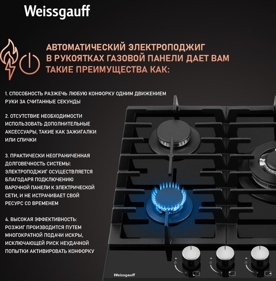 Автоматический электроподжиг, независимо встроенный в каждую из рукояток, позволит зажечь любую конфорку за долю секунды, всего одним нажатием и поворотом руки, не прибегая к дополнительным приспособлениям!