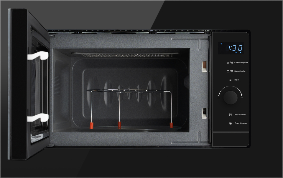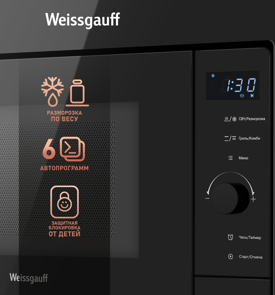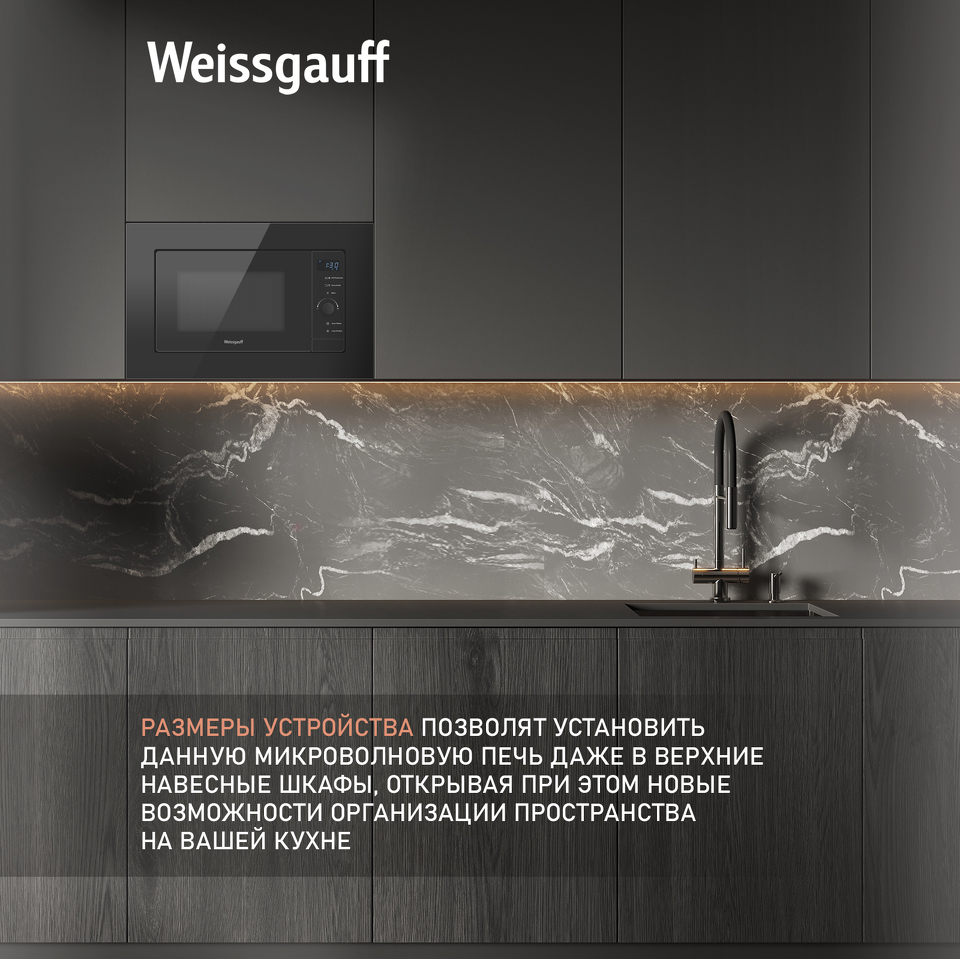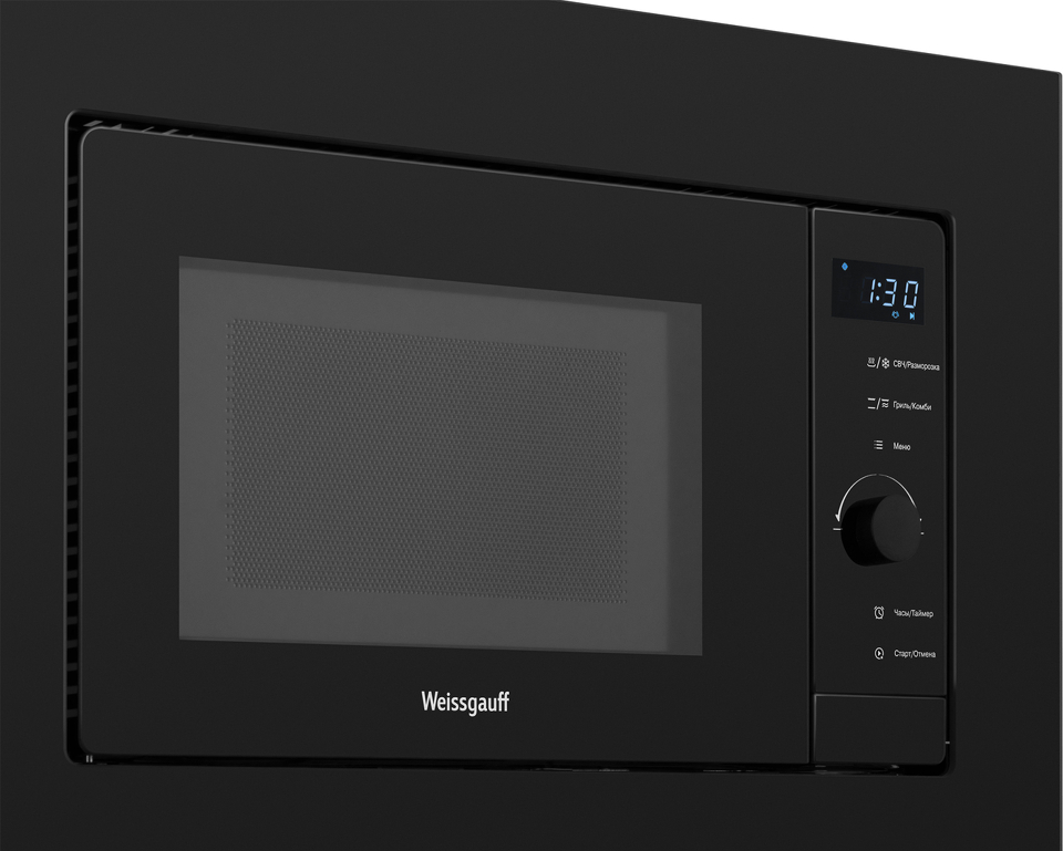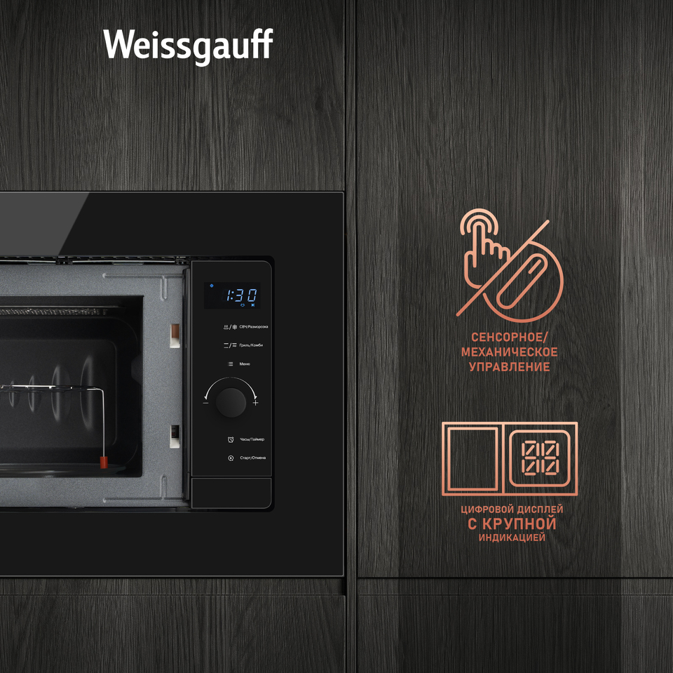Встраиваемая микроволновая печь Weissgauff с объемом 20 литров, выполненная в черном закаленном стекле, равномерно разогревает еду при помощи поворотного стола, а также оснащена грилем с возможностью работы в комбинированном режиме и набором программ автоменю!