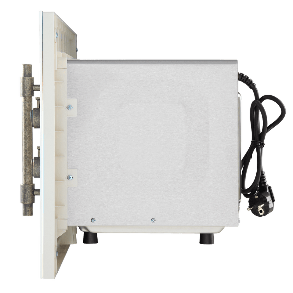 Особенности: без поворотного стола, фасад из прочного стекла, гриль, открытие дверцы в любом режиме, подсветка камеры, дверца навесная, механический таймер, звуковой сигнал, бронзовые цельнометаллические ручки управления.