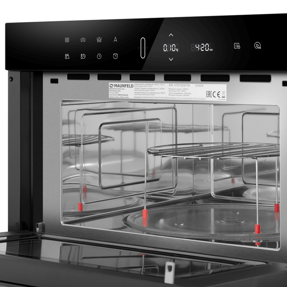 Микроволновая печь Maunfeld с горизонтальной панелью управления органично впишутся в интерьер Вашей кухни. Стеклянная дверца открывается сверху вниз, как в духовых шкафах. Рабочая камера этой печи имеет большой объём 34 л.