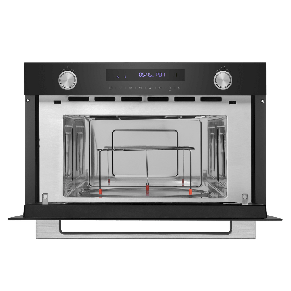Встраиваемая микроволновая печь. Передняя панель выполнена из стекла. Свет зажигается при открытии дверцы. Настройка программ и таймера осуществляется при помощи сенсорного дисплея.