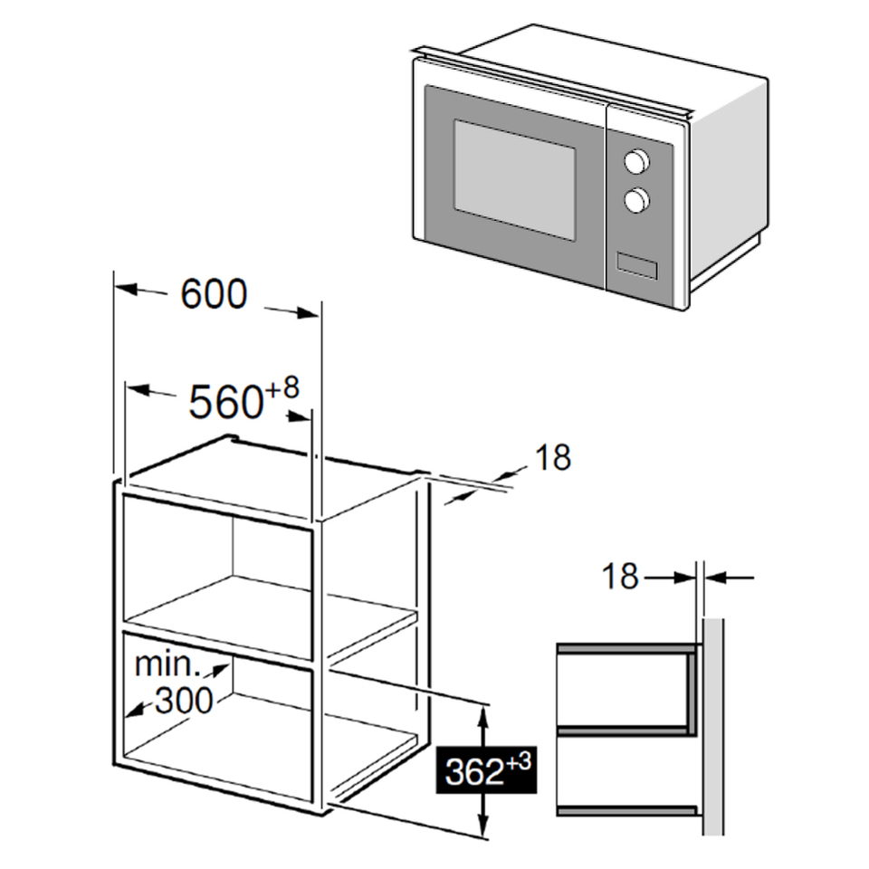 Размеры микроволновой печи делают ее компактной и удобной для встраивания в кухонный гарнитур. Вращающееся кольцо и стеклянный поддон обеспечивают удобство использования.