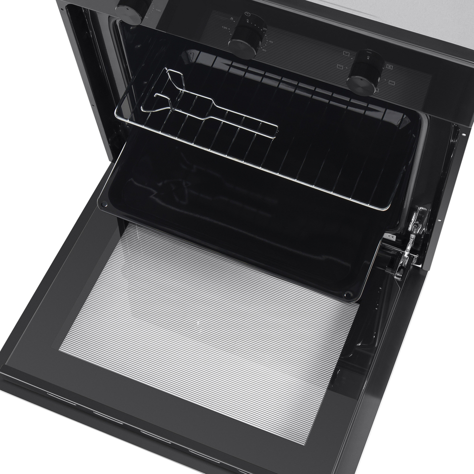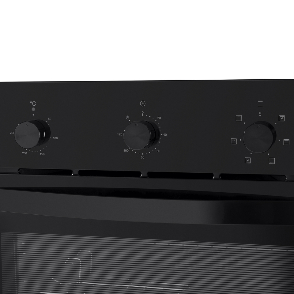 Механическое управление работой духовки осуществляется цельнометаллическими поворотными ручками черного цвета. Можно выбирать режим работы, температуру (50°-250°C) и устанавливать таймер (до 120 мин). В данной модели поддерживается 6 функций: внутреннее освещение, традиционный нагрев, гриль, нижний нагрев, конвекционный нагрев, пицца.