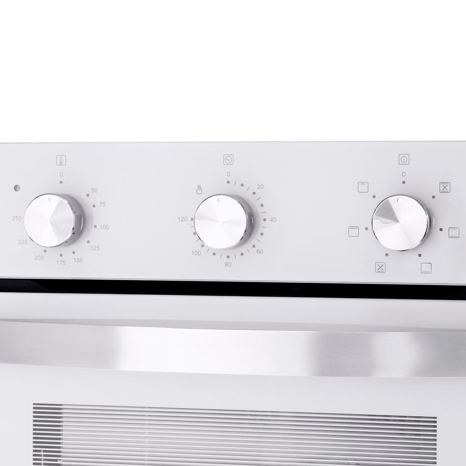 Механическое управление работой духовки осуществляется поворотными ручками. Можно установить таймер (до 120 мин), выбрать температуру (50°-250°C) и один из 7-ми режимов работы: внутреннее освещение, традиционный нагрев, большой гриль, конвекция с нижним нагревом, нижний нагрев, конвекционный нагрев, малый гриль.