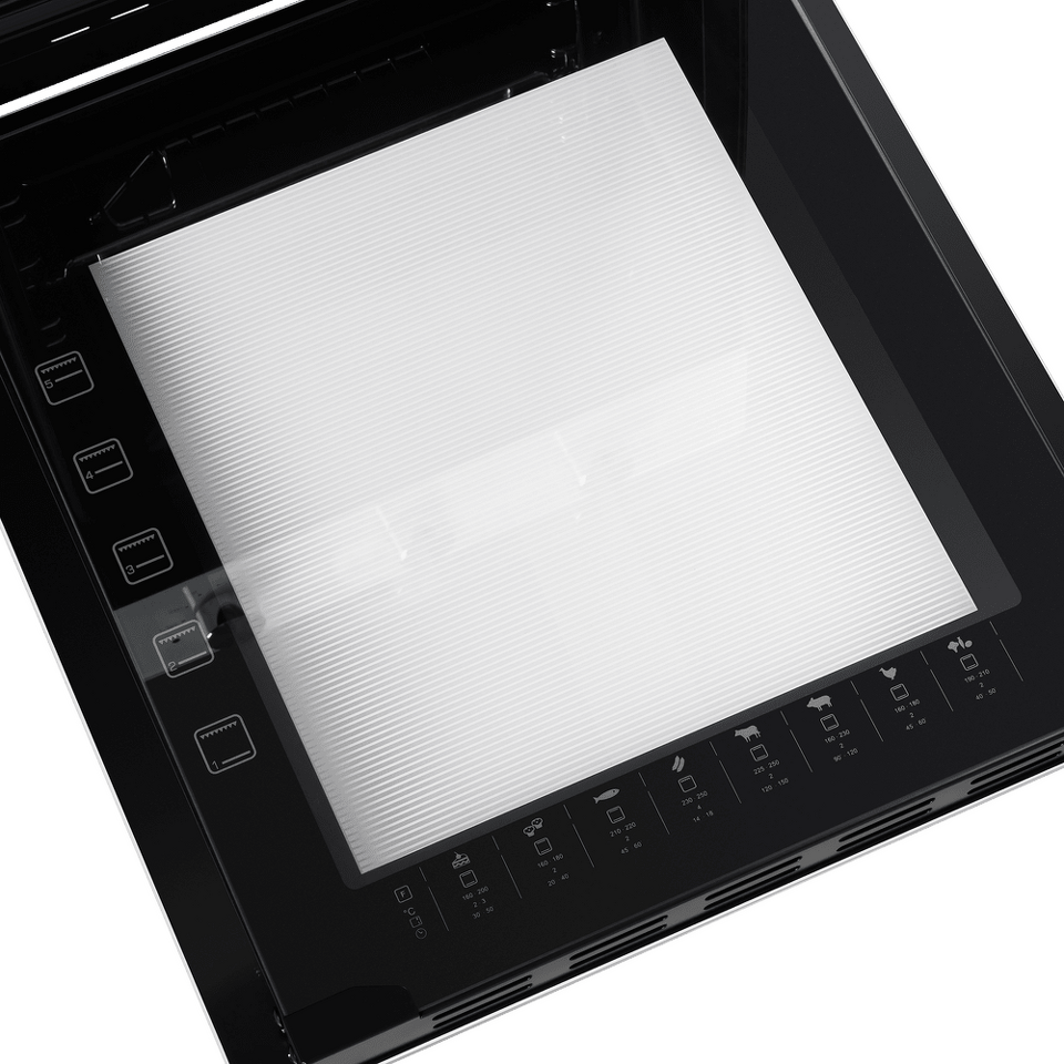 Фронтальная панель духовки сделана из высококачественного жаропрочного тонированного стекла белого цвета. Цельнометаллическая ручка дверцы и ручки управления остаются холодными в процессе готовки.