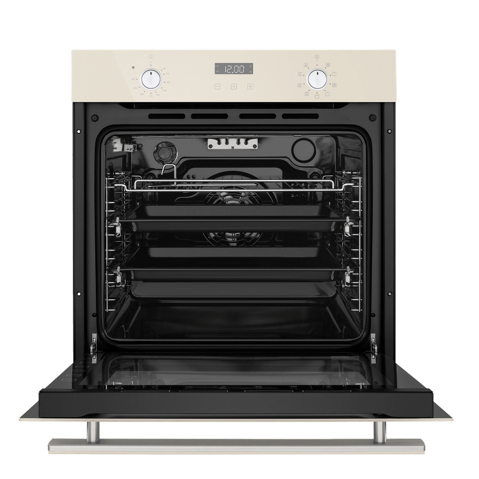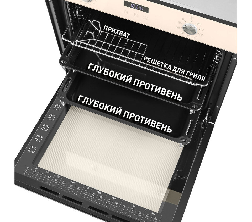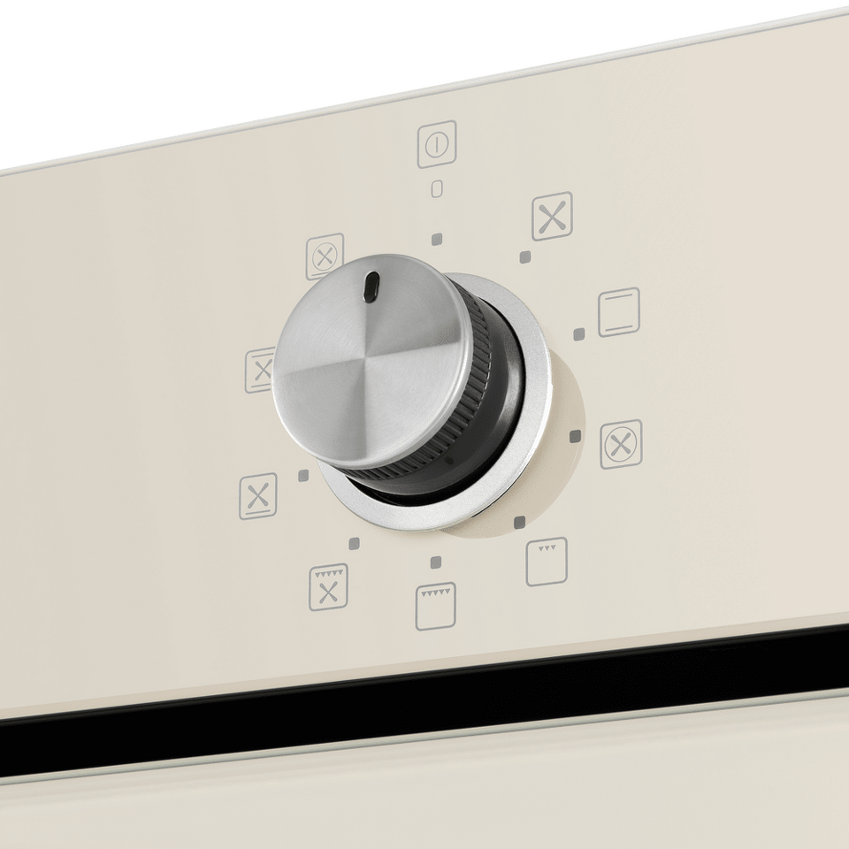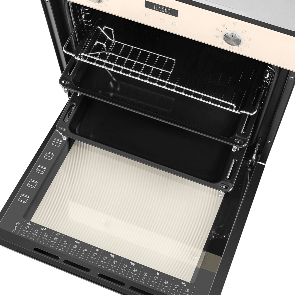 Фронтальная панель духовки и фасад ручки дверцы сделаны из высококачественного жаропрочного стекла бежевого цвета, окрашенного по всему объему, что является отличительной чертой бытового прибора премиум-класса.