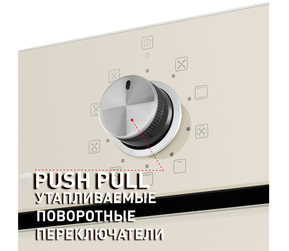 Комбинированное управление реализовано в виде сенсорного дисплея и поворотных цельнометаллических ручек PUSH PULL, которые легким нажатием убираются внутрь корпуса. Можно выбрать режим работы, температуру (50°-250°C), установить таймер и блокировку от детей. В данной модели есть 10 режимов: традиционный нагрев, большой гриль, конвекционный нагрев, малый гриль, разморозка, конвекция с нижним нагревом, горячий воздух, пицца, объемный турбогриль, освещение.