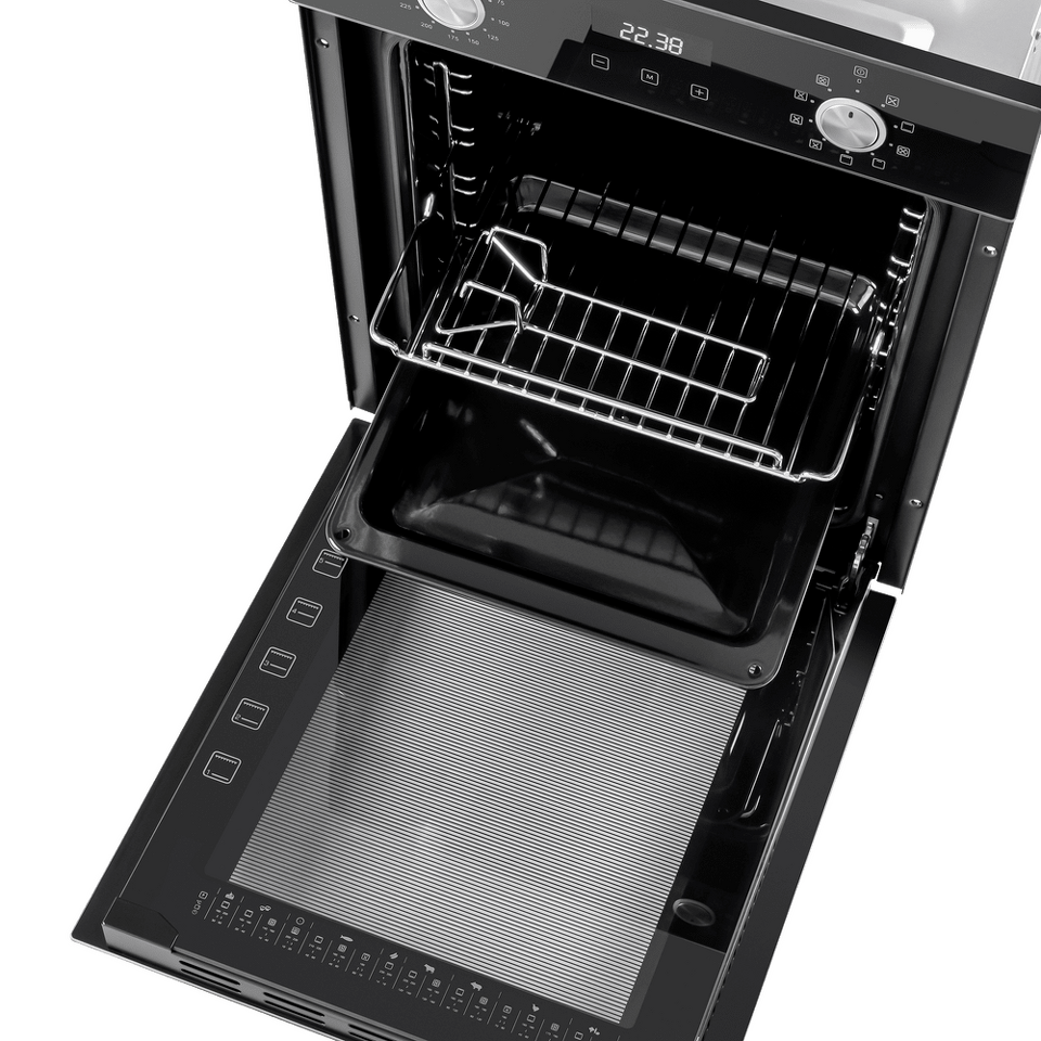 Комбинированное управление реализовано в виде сенсорного дисплея и поворотных ручек PUSH PULL, которые легким нажатием убираются внутрь корпуса. Можно выбрать режим работы, температуру (50°-250°C), установить таймер и блокировку от детей. В данной модели есть 9 режимов: верхний/нижний нагрев, усиленная конвекция, гриль/верхний нагрев/конвекция, разморозка, гриль/верхний нагрев, гриль, конвекция с нижним нагревом, нижний нагрев, интенсивная выпечка, освещение.