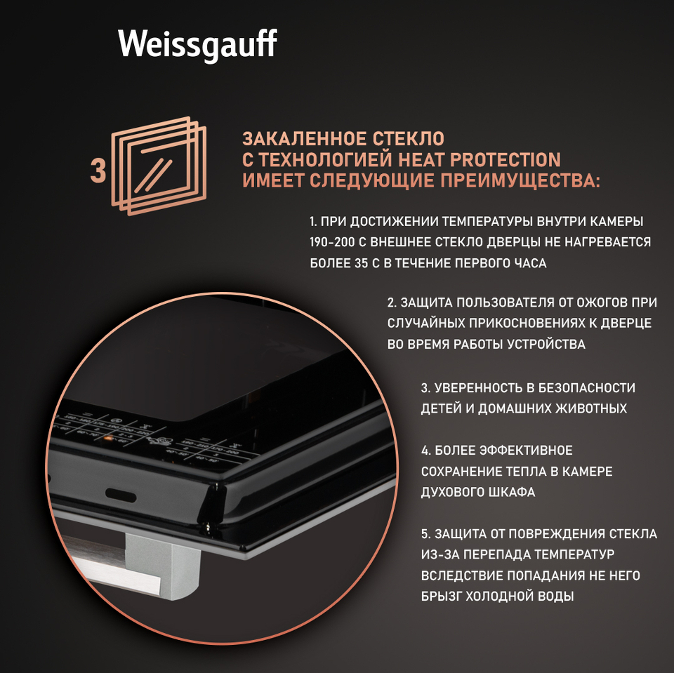 Тройное стекло дверцы с технологией защиты от нагрева Heat Protection, при которой во время достижения температуры внутри камеры 190-200 С внешнее стекло дверцы не нагревается более 35 С в течение первого часа. Эта технология воплощает в себе весь подход к безопасности и термозащите, который Weissgauff реализовали в данной модели. Такое стекло обеспечивает вам значительно большую степень защиты при случайных прикосновениях к нагревающейся дверце плиты, чем в моделях, не оснащенных технологией многослойного стекла. Для нас в Weissgauff важно, чтобы работа с бытовой техникой была не только приятной, но и безопасной!