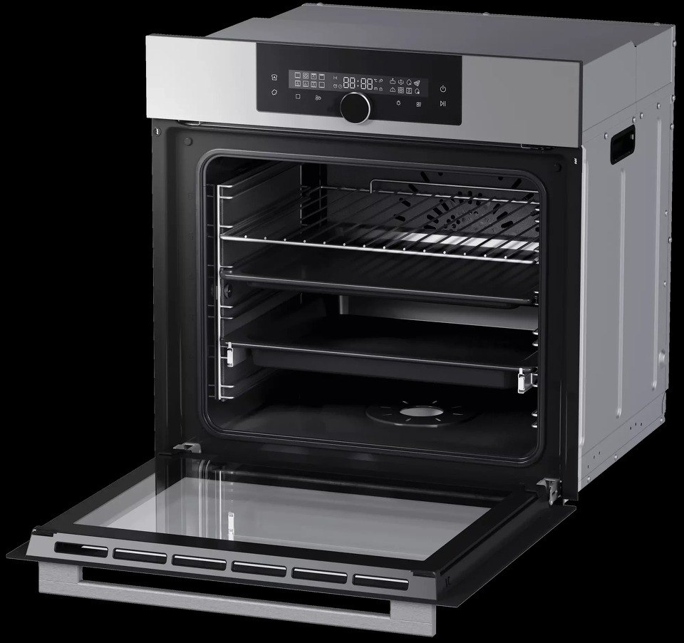Духовой шкаф поддерживает регулировку температуры нагрева от 30 до 300 °C, что актуально при расстойке теста. Тройное остекление дверцы избавляет от ожогов. Режим конвекции обеспечивает равномерное распределение потоков теплого воздуха для хрустящей золотистой корочки на мясе или птице.