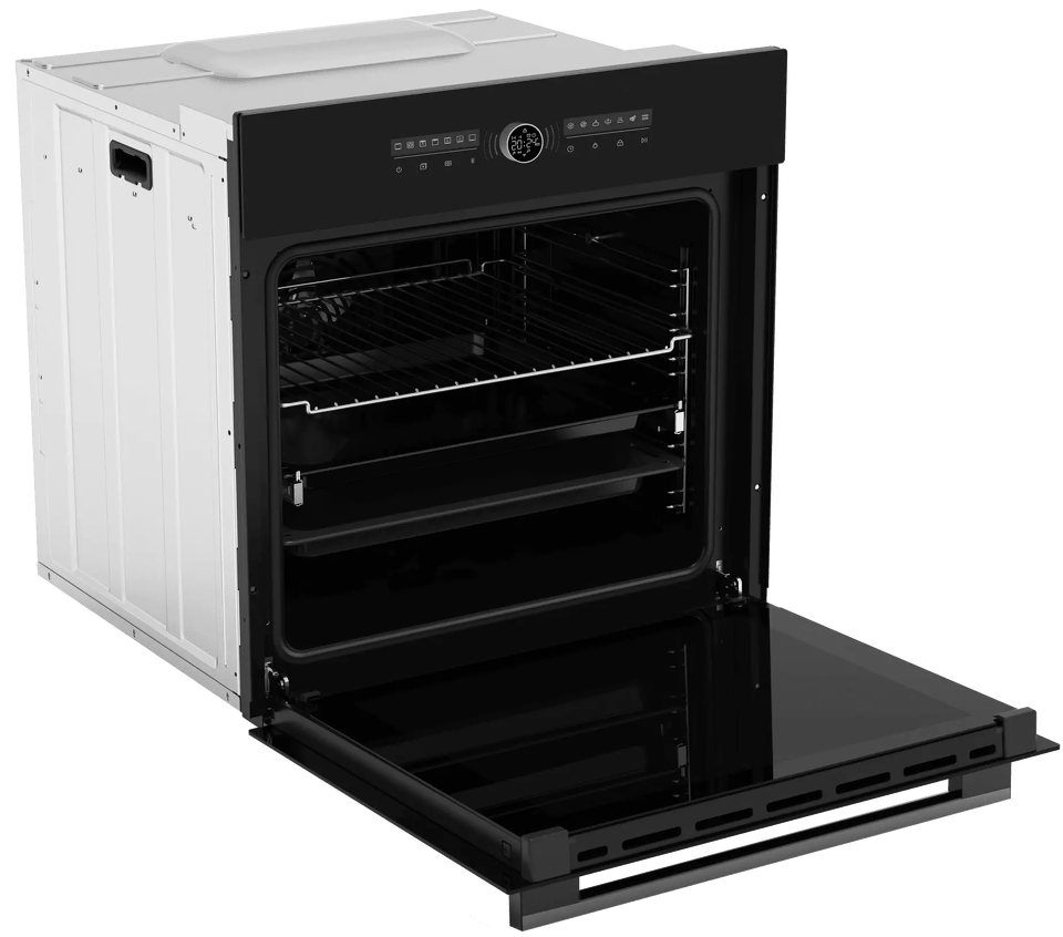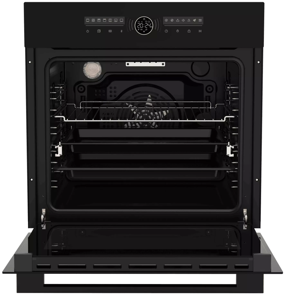 Духовой шкаф HOX-FT5AMTB имеет обновленную систему управления: сенсорная панель добавляет удобства в уходе, а центральный поворотный переключатель, помимо своего расширенного функционала, оснащен LED дисплеем с индикацией статуса работы и декоративной динамической индикацией. Максимальная температура нагрева составляет 310 градусов. Духовой шкаф оборудован выдвижными телескопическими направляющими, функцией аква очистки и тройным остеклением дверцы, что делает использование и невероятно комфортным, и безопасным.