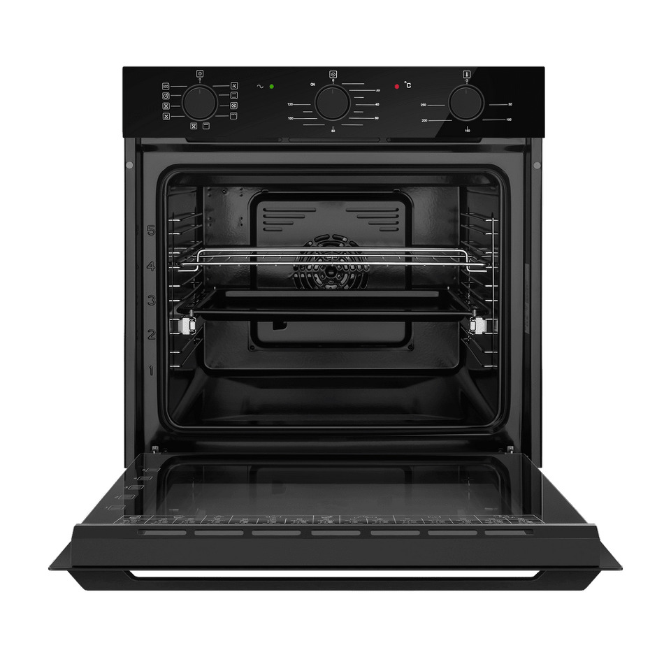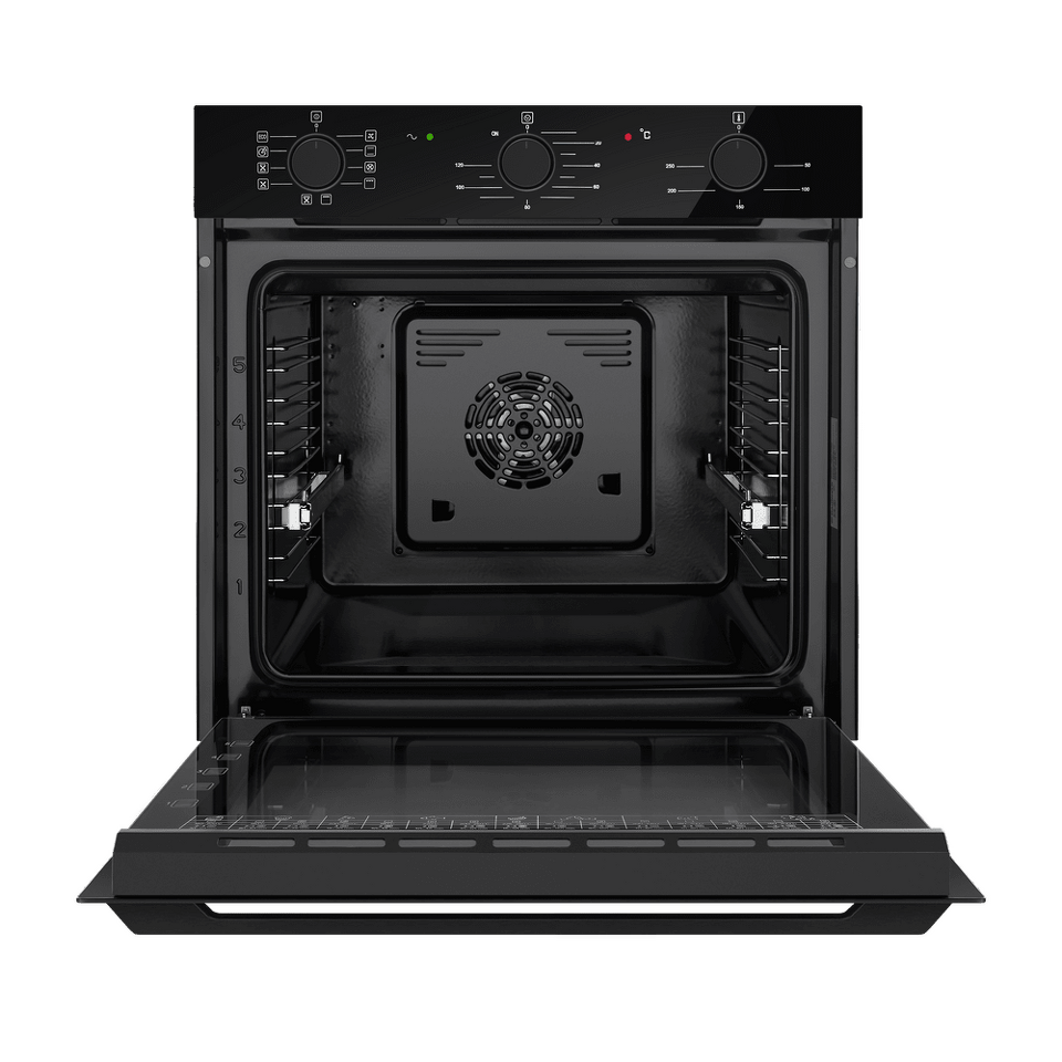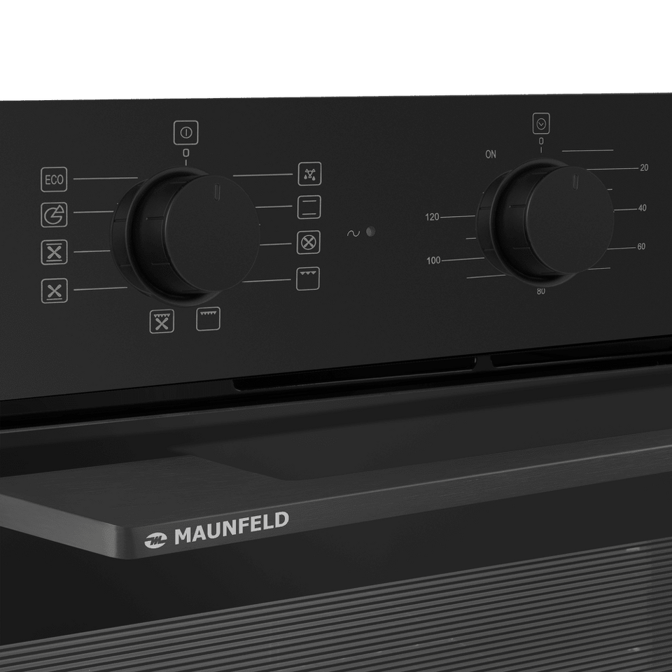 Встраиваемый электрический духовой шкаф с объемом 76 литров оснащен удобными телескопическими направляющими и простым механическим управлением с утапливаемыми переключателями.