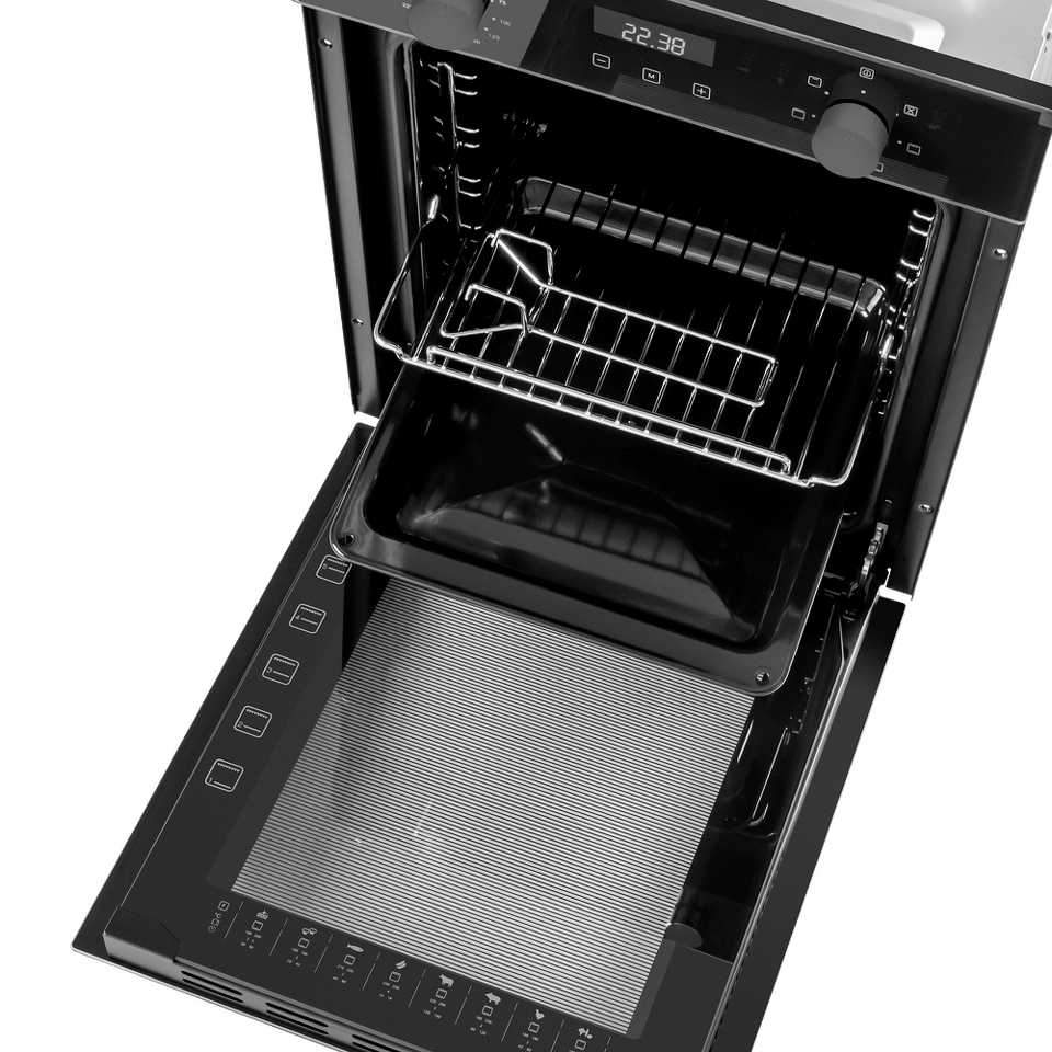 Комбинированное управление реализовано с помощью сенсорного дисплея и цельнометаллических ручек PUSH PULL. Можно установить таймер, выбрать температуру (50°-250°C) и один из 7-ми режимов работы: внутреннее освещение, традиционный нагрев, большой гриль, конвекция с нижним нагревом, нижний нагрев, конвекционный нагрев, малый гриль.