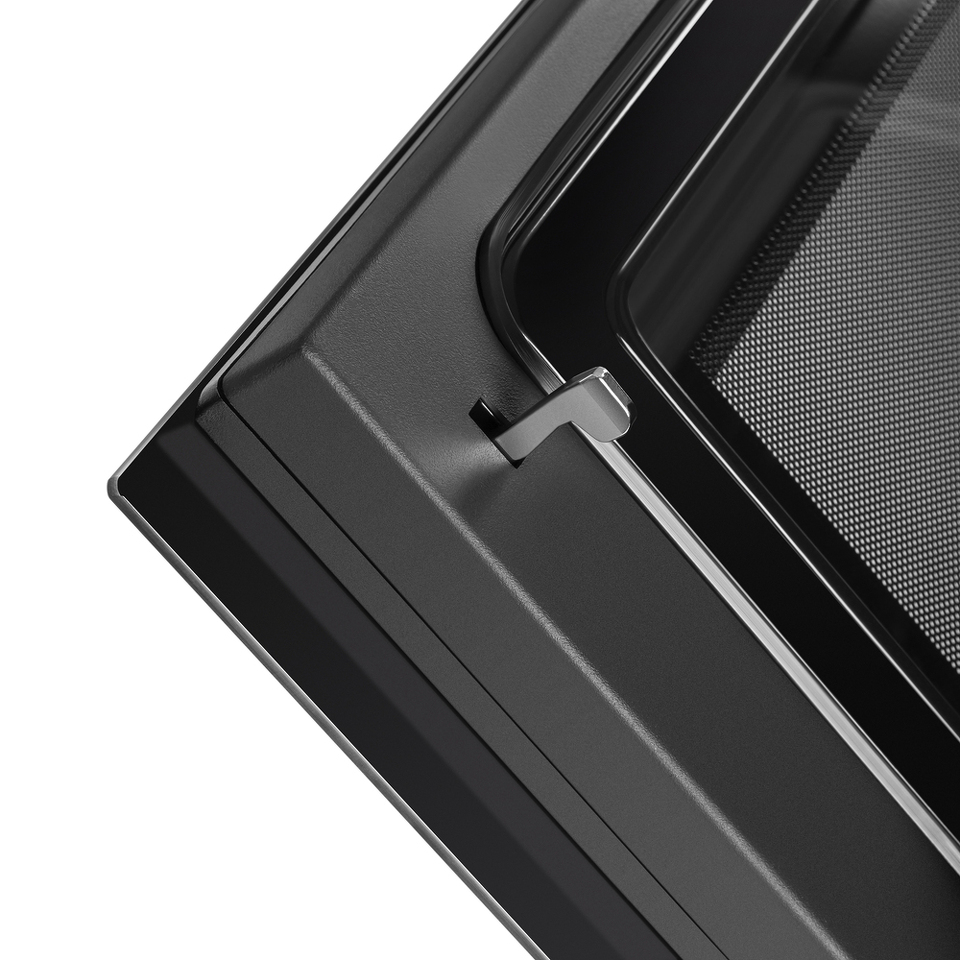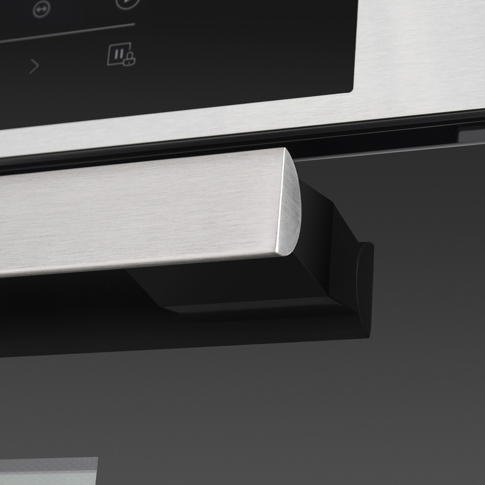 Фронтальная панель сделана из высококачественного жаропрочного стекла. Цельнометаллическая ручка дверцы из матированной нержавеющей стали лаконично поддерживает общий стиль и не нагревается во время готовки.