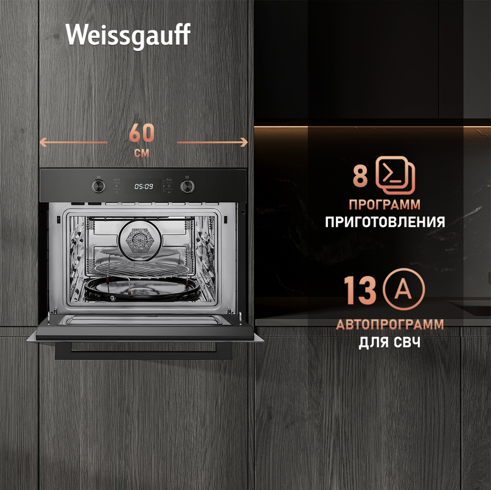 Компактный духовой шкаф с функцией СВЧ от Weissgauff, выполненный в чёрном цвете - это функционал сразу двух полноценных устройств, воплощённый в одной модели, оснащенной тройным стеклом в дверце и расширенной комплектацией!